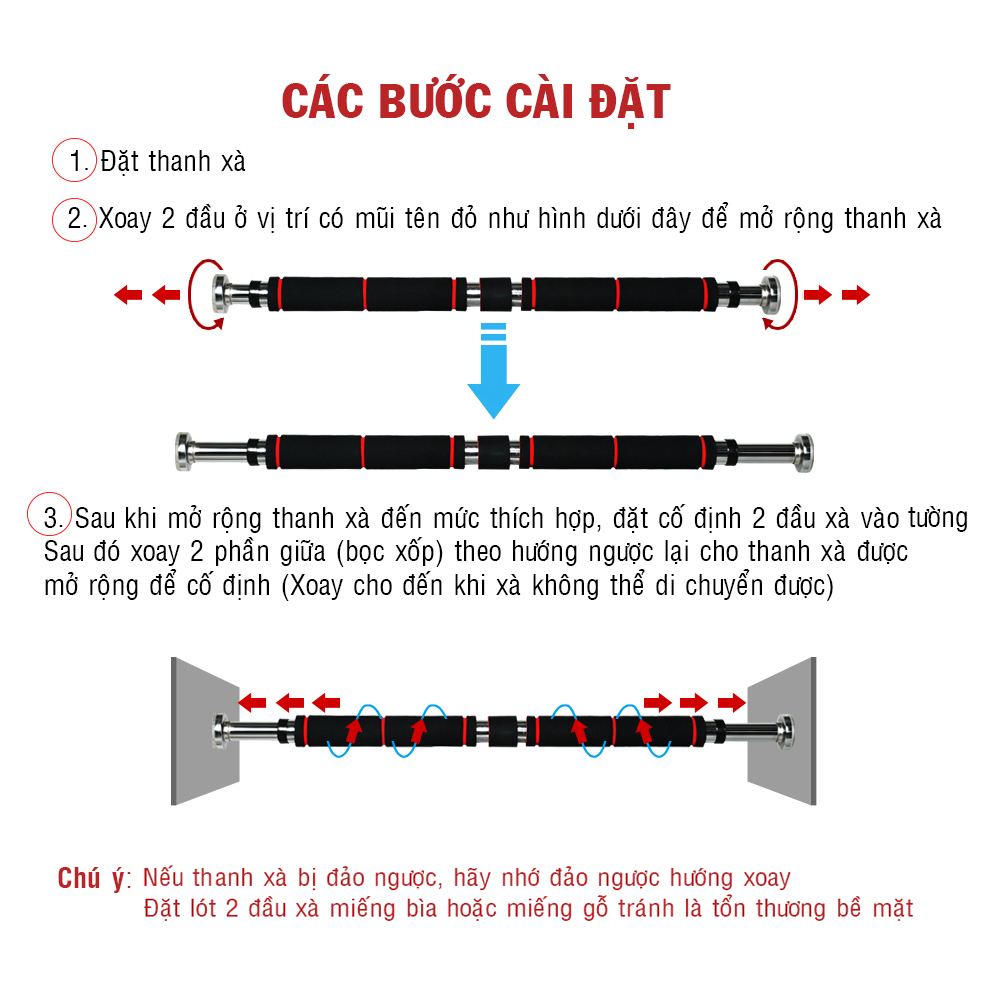Mô Tả Sản Phẩm: Xà đơn gắn cửa cải tiến có chốt chống xoay (60cm-100cm)(82cm-130cm)(116cm-150cm) (Khách lựa chọn kích thước) Xà đơn có chốt chống xoay: Chiều dài : 62-100cm 82-130cm và 100-150cm Mẫu 62-100cm