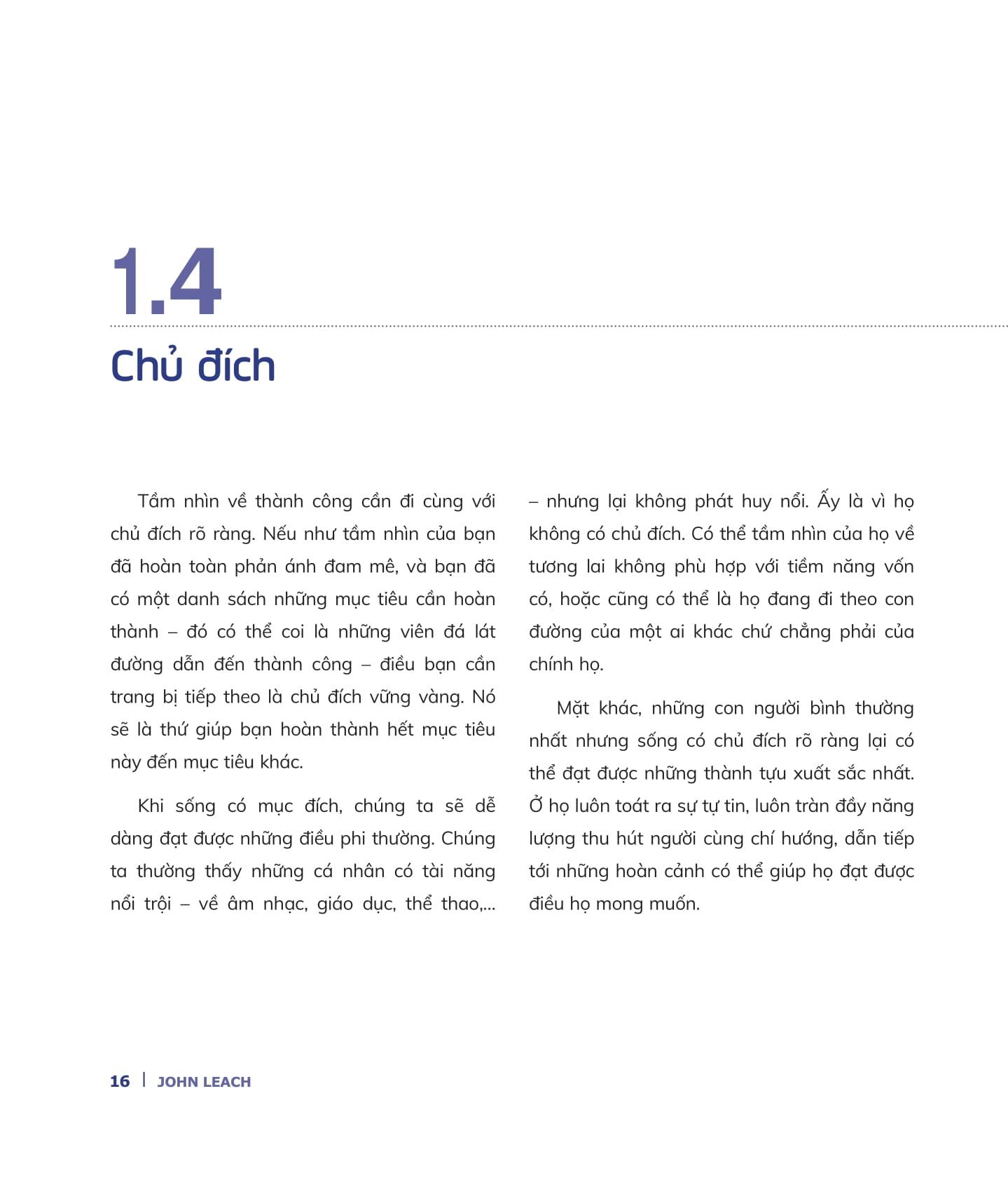 Những tố chất ấy, tác giả John Leach gọi là “10 bước đến thành công”, và sẽ giới thiệu cặn kẽ đến bạn qua cuốn sách cùng tên này. Hãy hiểu cho rõ rằng việc này không hề dễ dàng, và chắc chắn không thể giúp bạn giải quyết các vấn đề trong cuộc sống một cách nhanh chóng. Con đường dẫn tới thành công không có lối tắt. Đó là lý do vì sao thành công thường được ví như một phần thưởng.