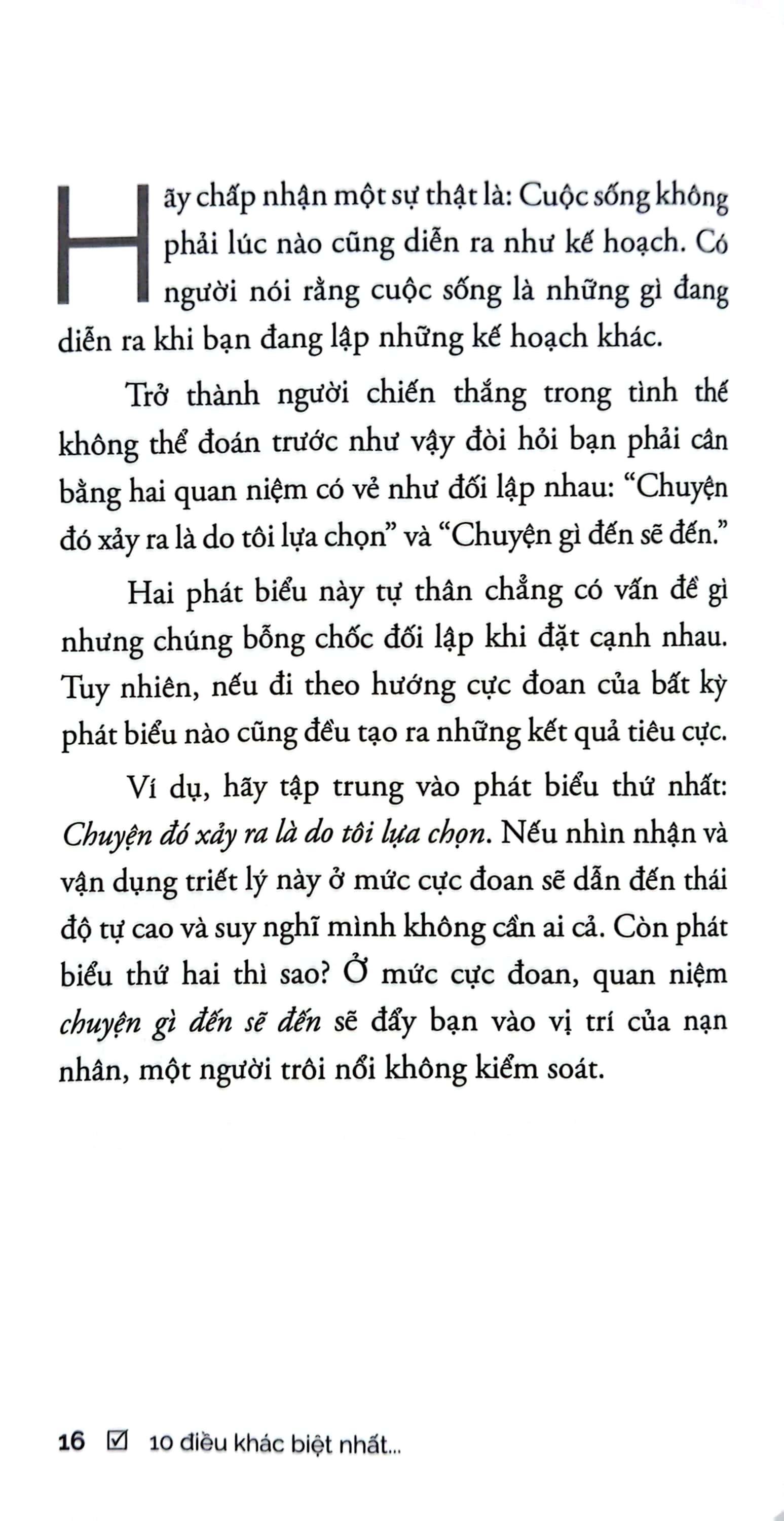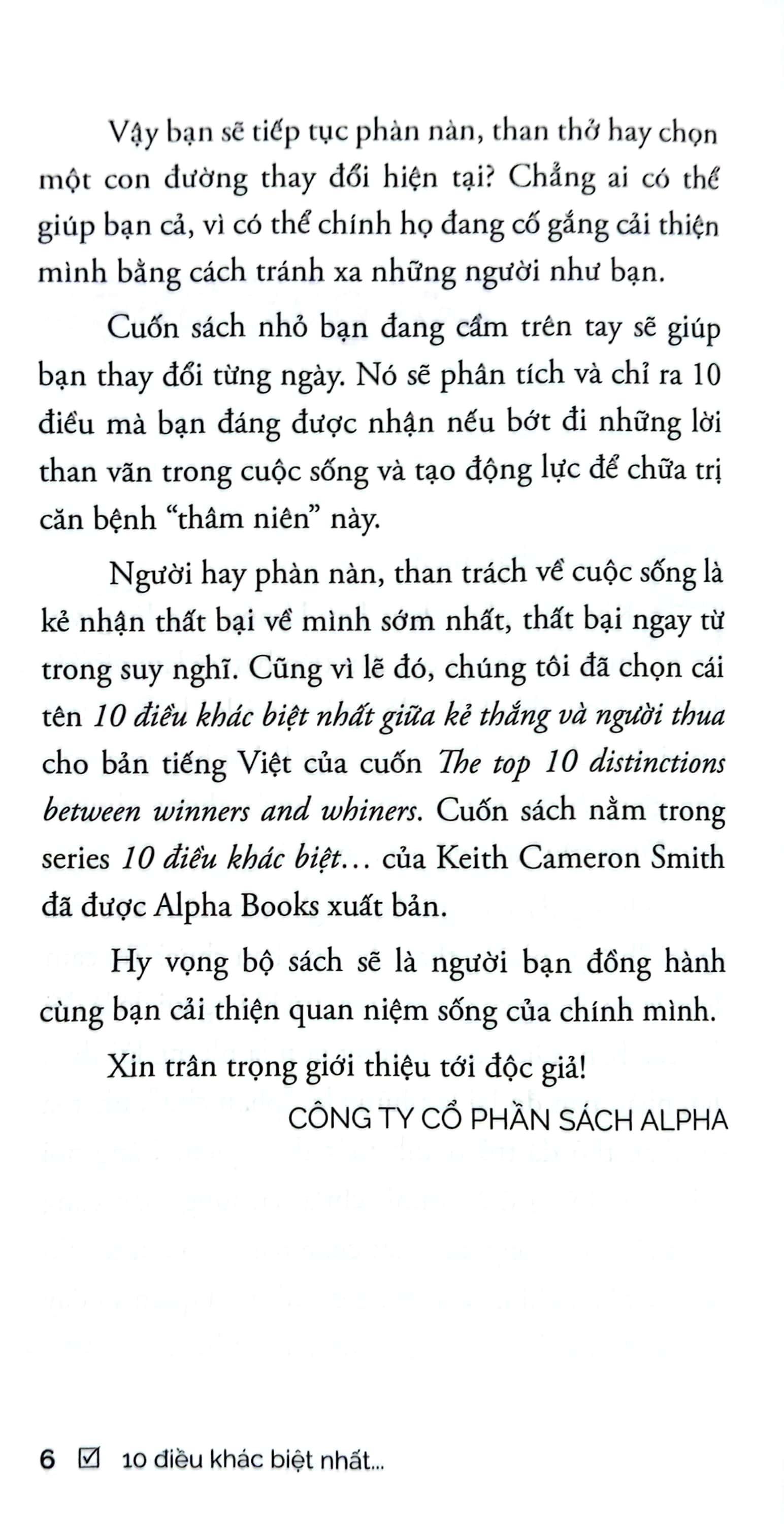 10 Điều Khác Biệt Nhất Giữa Kẻ Thắng Và Người Thua Khi gặp khó khăn hay không vừa lòng với một chuyện gì đó, đầu tiên bạn sẽ làm gì? Tôi dám cá rằng, đến 80% độc giả sẽ trả lời là than thở với ai đó. Chuyện đó chẳng có gì là bất hợp pháp cả, đơn giản chỉ là bạn muốn trút sạch những chuyện đen đủi và cầu cứu một sự cảm thông. Nhưng đã bao giờ bạn nghĩ đến cảm xúc của người “hứng” những than thở cho bạn chưa? Tôi cam đoan là nó chẳng có gì vui vẻ cả, trừ khi người đó là đối thủ của bạn. Điều quan trọng hơn là những lời than thở, phàn nàn đó lại là những kẻ “phản chủ”, nhất là khi than thở đã trở thành một thói quen. Càng nói nhiều về những điều m.ình chưa hài lòng, bạn càng cảm thấy cuộc sống này thật chán nản và buồn tẻ. Nó cũng sẽ nhấn chìm bạn trong cái nhìn bi quan và đẩy bạn ra xa khỏi hội những người hạnh phúc. Vậy bạn sẽ tiếp tục phàn nàn, than thở hay chọn một con đường thay đổi hiện tại? Chẳng ai có thể giúp bạn cả, vì có thể họ đang cố gắng cải thiện m.ình bằng cách tránh xa những người như bạn. Cuốn sách nhỏ bạn đang cầm trên tay sẽ giúp bạn thay đổi từng ngày. Nó sẽ phân tích và chỉ ra 10 điều mà bạn đáng được nhận nếu xóa đi những lời than vãn trong cuộc sống và tạo động lực để c.hữa trị căn bệnh “thâm niên” này. Người hay phàn nàn, than trách về cuộc sống là kẻ nhận thất bại về m.ình sớm nhất, thất bại ngay từ trong suy nghĩ.