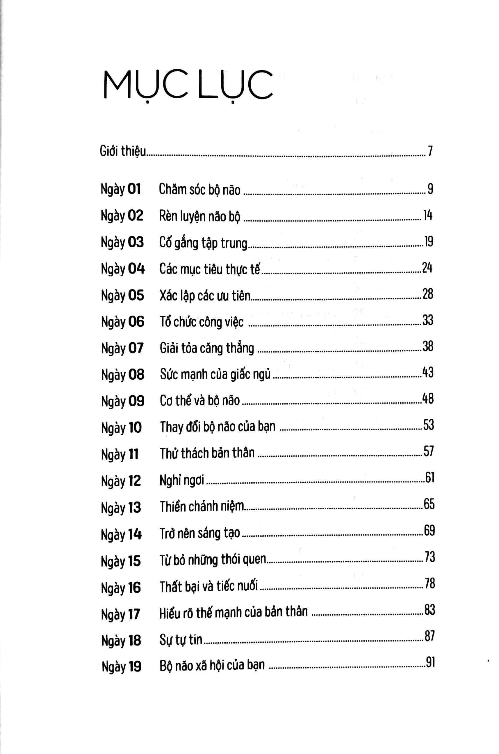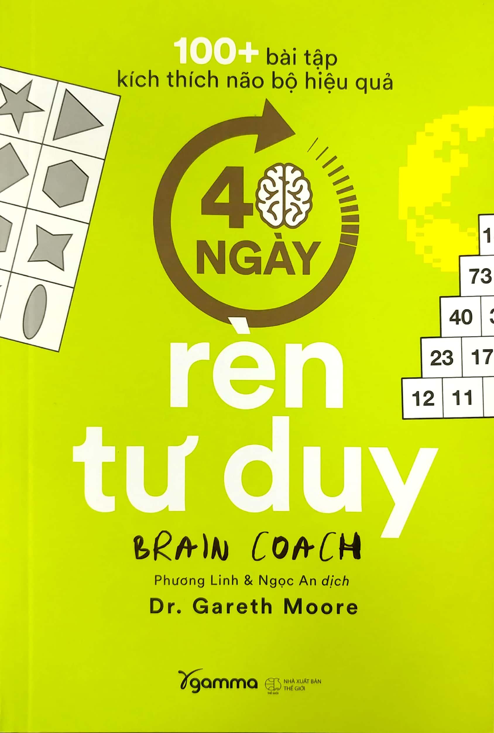 100+ Bài Tập Kích Thích Não Bộ Hiệu Quả: 40 Ngày Rèn Tư Duy Bộ não đóng vai trò then chốt trong mọi khía cạnh cuộc sống của chúng ta, vậy nên nó rất cần được chăm chút. Cuốn sách 40 ngày rèn tư duy là một chương trình huấn luyện theo ngày, khám phá não bộ theo từng bước nhỏ và đơn giản, giúp người đọc hiểu sâu cơ chế hoạt động của bộ não nhằm tận dụng tốt hơn các khả năng sẵn có, đồng thời cải thiện các kỹ năng của não bộ trong chưa đầy một tháng rưỡi.