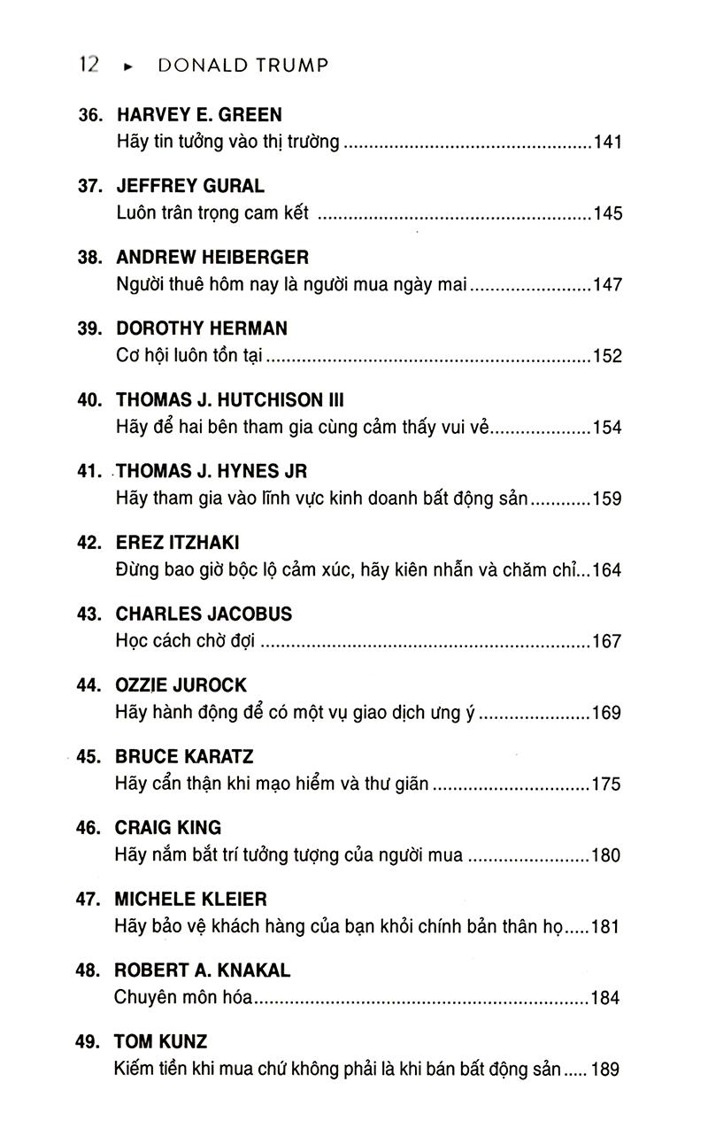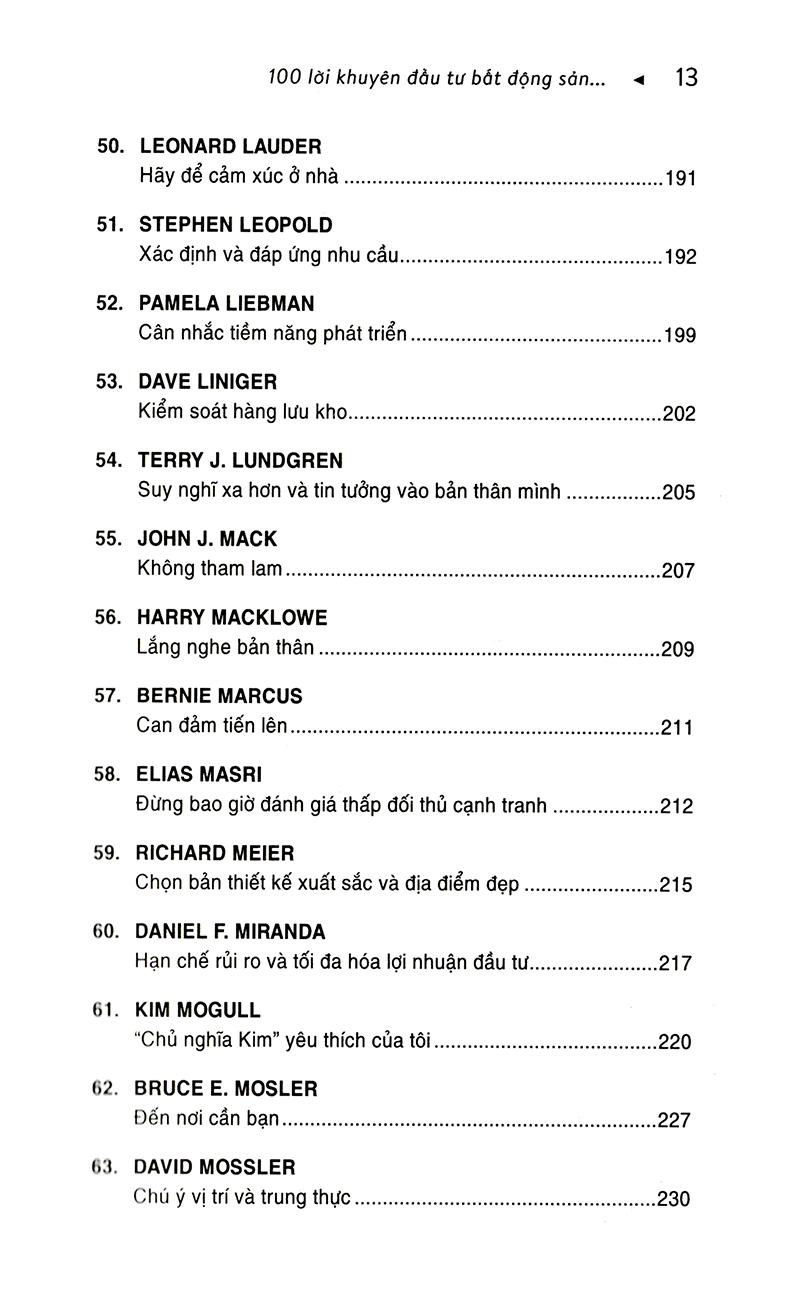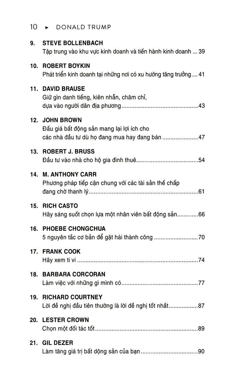 Trong cuốn sách này, bạn sẽ thấy sự sáng suốt khác thường có được là nhờ vào những kinh nghiệm và bài học mà những nhân vật có thế lực trong kinh doanh bất động sản trên khắp nước Mỹ phải trải bao khó khăn mới rút ra được. Có rất nhiều điều mà lẽ ra tất cả chúng ta đã có thể làm tốt hơn: từ việc bỏ lỡ cơ hội, dự đoán sai về thị trường đến việc thương lượng quá cao hoặc quá thấp. Những nhà kinh doanh này - cả nam lẫn nữ - sẽ kể cho bạn biết họ đã học được gì.