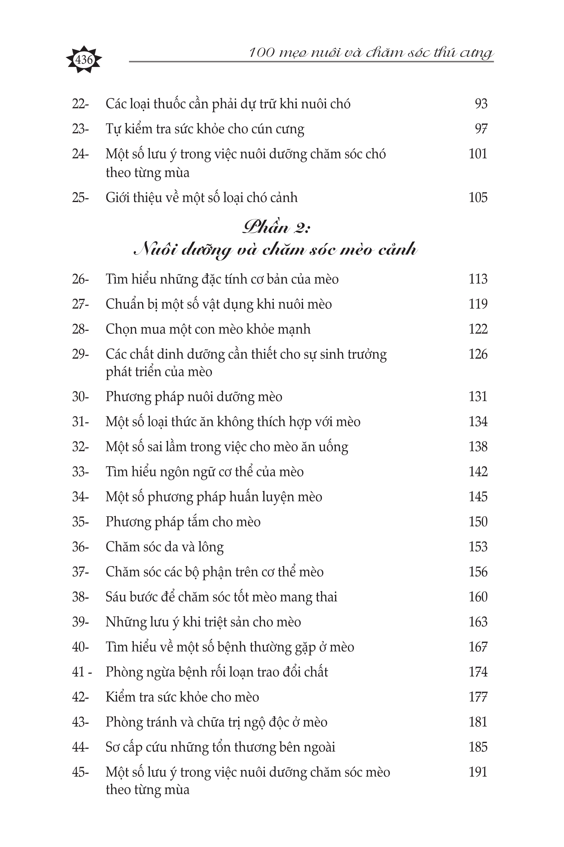 Nhưng việc nuôi thú cưng lại không hề đơn giản giống như nhiều người lầm tưởng, mà cần phải có phương pháp nuôi dưỡng, chăm sóc hợp lý và khoa học. Nếu không, bạn rất khó nuôi sống được thú cưng, ngược lại, còn làm ô nhiễm môi trường sống, thậm chí còn gây ra một số bệnh truyền nhiễm và một số phiền toái trong cuộc sống. Chính vì thế, chúng tôi đã biên soạn cuốn sách “100 mẹo nuôi dưỡng và chăm sóc thú cưng”, với mục đích giúp mọi người nuôi dưỡng và chăm sóc tốt thú cưng, để từ đó có được niềm vui từ việc nuôi thú cưng.