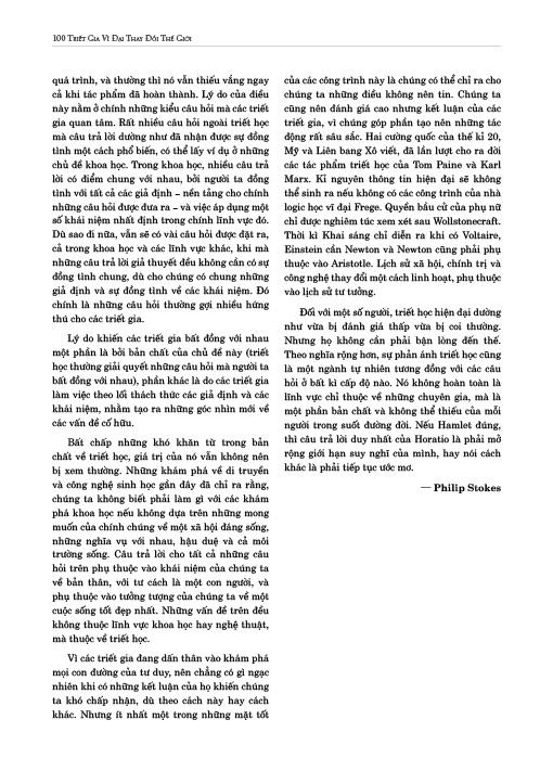 Bao quát tư tưởng triết học, khoa học, chính trị và tôn giáo trong khoảng thời gian 2.500 năm, 100 Triết Gia Vĩ Đại Thay Đổi Thế Giới là cuốn sách chỉ dẫn tuyệt vời về lịch sử triết học và những tiến bộ con người đã đạt được trong việc giải thích thế giới xung quanh.