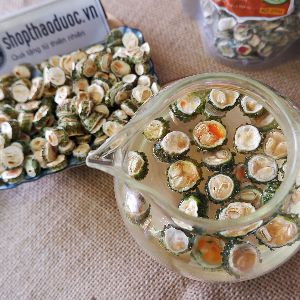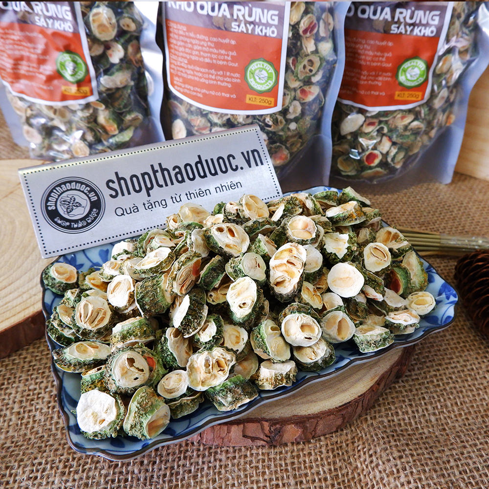 - Support for prevention and treatment of Gout. I. Giới thiệu về khổ qua rừng (mướp đắng rừng) thái lát: Khổ qua rừng hay còn gọi là mướp đắng rừng. Quả hình thoi, gần giống như khổ qua nhà trồng nhưng kích thước bé hơn. Khi còn non, trái có màu xanh, khi chín có màu vàng hồng. Khổ qua rừng (mướp đắng rừng) được thu hái quanh năm. Sau khi thu hoạch sẽ được phân loại, mang đi rửa sạch qua ba lần nước. Sau đó thái lát thành từng khúc nhỏ, cuối cùng là đem đi sấy lạnh. II. Công dụng từ khổ qua rừng (mướp đắng rừng) thái lát: