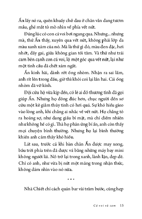 Ẩn không dám nhìn lên, anh chỉ muốn tránh bầu trời đẹp đẽ ấy, muốn nhanh nấp vào công ty để nhìn những trần nhà xám lạnh tẻ nhạt. Sự tẻ nhạt an toàn cố hữu, như triệu năm rồi vẫn vậy, có thể tìm thấy ở bất kì đâu trong kí ức: buồn chán và cứng ngắc. Còn hơn phải nhìn thấy bầy cá voi bơi giữa những trái cam, tất cả đều khổng lồ, tươi sáng và hiền hòa tới mức giả tạo.”