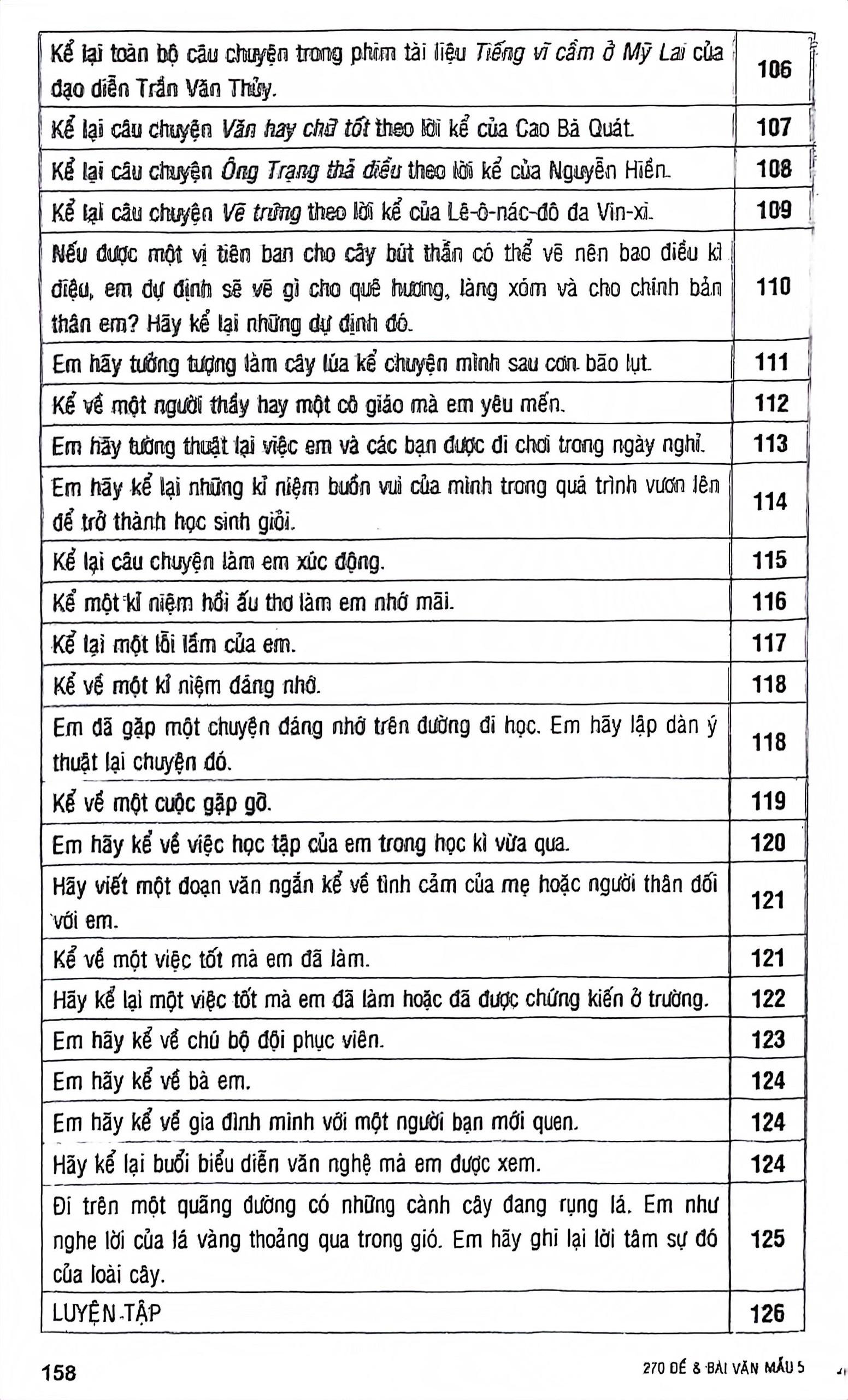 Các đề và bài văn trong sách được sắp xếp theo kiểu bài Tập làm văn, bắt đầu từ yêu cầu tập làm văn đơn giản là nói (đối với lớp 2, 3) và kể (đối với lớp 4, 5). Tiếp theo là các yêu cầu tập làm văn khó hơn (kể, gọi điện, viết, lập danh sách, mục lục, lập thời gian biểu, đặt câu theo mẫu đối với lớp 2; kể, giới thiệu hoạt động, viết lại bản tin, thuật lại ý kiến, điện báo, ghi chép sổ tay, thông báo, viết đơn, viết giấy mời, viết thư, báo cáo hoạt động, tập tổ chức cuộc họp đối với lớp 3, trao đổi, giới thiệu, viết thự, miêu tả đối với lớp 4 và miêu tả, thống kê, đơn từ, biên bản, thuyết trình – tranh luận và lập chương trình hoạt động đối với lớp 5).