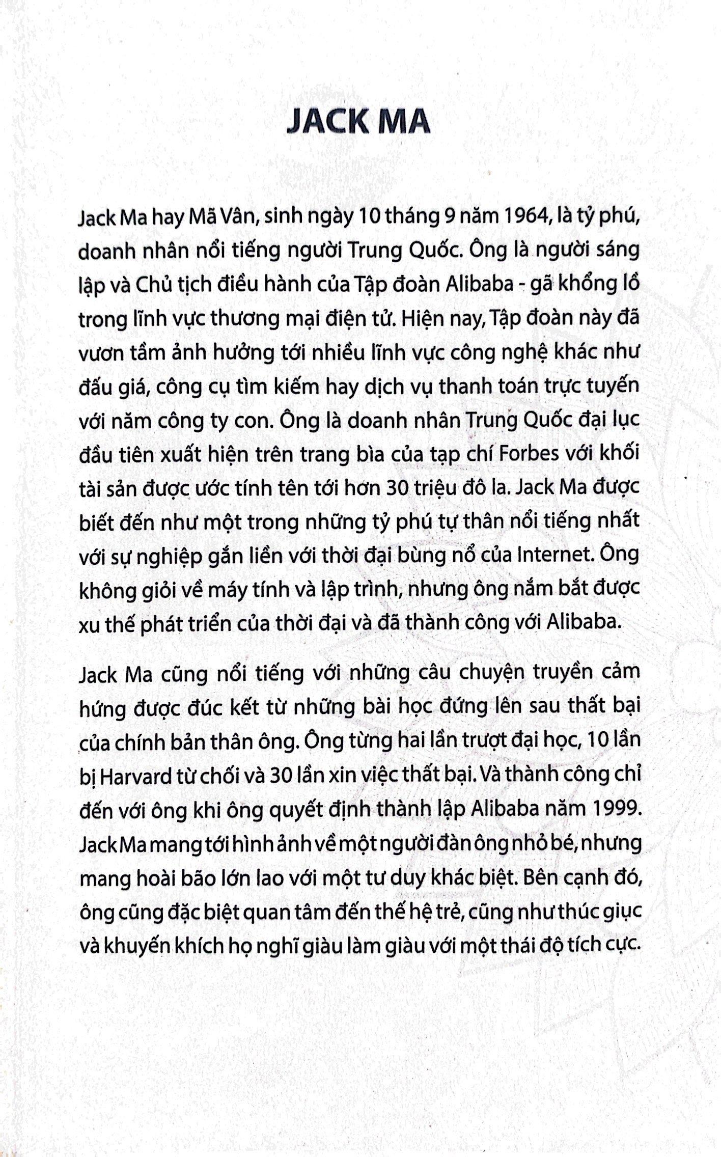30s Jack Ma Thay Đổi Bạn Mỗi Ngày Trong cuộc sống luôn có những khoảnh khắc thay đổi cuộc đời. Hãy đặt bộ sách 30 giây thay đổi bạn mỗi ngày lên giá sách đầu giường, trên bàn làm việc… hoặc bất kỳ đâu bạn hiện diện nhiều nhất trong ngày như một người bạn thân thiết, mở đọc một hai trang mỗi sáng thức dậy, trước khi đi ngủ hoặc khi bạn cần những khoảng lặng trước những vấn đề, trở ngại, bạn sẽ luôn tìm thấy những lời khuyên, những chia sẻ, cùng bạn vững bước và tiến xa hơn.