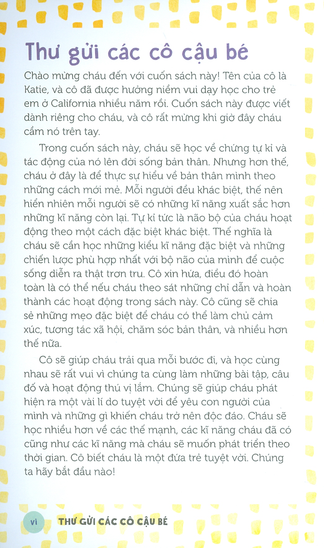 Tự kỉ là gì? Tác động của chứng tự kỉ lên đời sống như thế nào? Vì sao lại mắc chứng tự kỉ? – Đó là một phần trong cuốn sách Khác Biệt Cũng Là Điều Bình Thường - Chứng Tự Kỉ Và Tôi này. Mỗi người đều khác biệt, thế nên hiển nhiên mỗi người sẽ có những kĩ năng xuất sắc hơn những kĩ năng còn lại. Tự kỉ tức là não bộ của trẻ hoạt động theo một cách đặc biệt khác biệt, và do đó, cha mẹ cũng như con trẻ cần trang bị những bị những kiểu kĩ năng đặc biệt và những chiến lược phù hợp nhất để cuộc sống diễn ra thật trơn tru. Khác Biệt Cũng Là Điều Bình Thường - Chứng Tự Kỉ Và Tôi bao gồm 35 bài tập và câu hỏi tương tác nhằm giúp những trẻ mắc chứng tự kỉ có được sự tự tin và những kĩ năng cần thiết để hội nhập với thế giới xung quanh. Những hoạt động vui vẻ này cũng giúp trẻ có thể hiểu chứng tự kỉ rõ hơn, đồng thời học cách đón nhận một vài khía cạnh tự kỉ có thế mạnh. Hãy để cuốn sách Khác Biệt Cũng Là Điều Bình Thường - Chứng Tự Kỉ Và Tôi trở thành một phần của hành trình cả đời cho các bạn nhỏ mắc chứng tự kỉ cùng cha mẹ, để học về tự kỉ, vượt qua các trở ngại và sau cùng, trân trọng con người thực của trẻ tự kỉ. “Cuốn sách này là một phần của hành trình cả đời cho bạn và con bạn, để học về tự kỉ, vượt qua các trở ngại, và sau cùng, trân trọng con người thực của đứa trẻ. Tôi biết ơn bạn đã chọn cuốn sách này trên hành trình ấy.”- Katie Cook