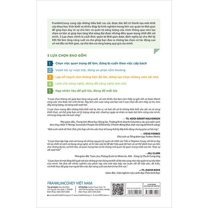 “Không ai thấu hiểu việc quản lý thời gian và năng suất hơn những nhà nghiên cứu và chuyên gia tư vấn của Franklin Covey. “5 Lựa chọn” mang đến những hiểu biết mới lạ, thú vị, và hơn tất cả là những hiểu biết sâu sắc và vô cùng thiết thực, có thể giúp bạn xử lý lượng công việc choáng ngợp và nhận ra toàn bộ tiềm năng của mình, cả trong công việc và cuộc sống” - TS. Heidi Grant Halvorson, Phó giám đốc, Trung tâm Khoa học Động lực, Trường Kinh doanh Columbia, tác giả cuốn sách bán chạy nhất: 9 Things Successful People Do Differently/ 9 hành động khác biệt của người thành công