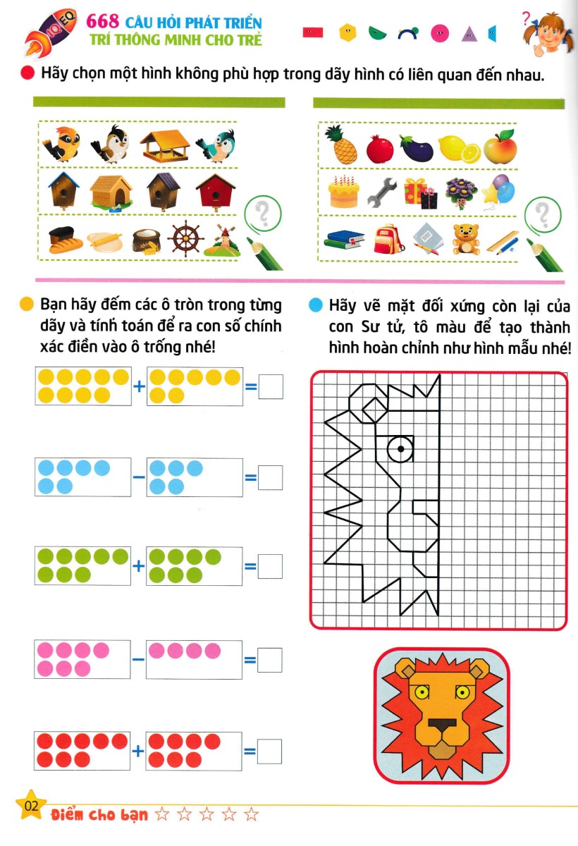 668 Câu Hỏi Phát Triển Trí Thông Minh Cho Trẻ - Tập 5 Bộ sách 668 Câu Hỏi Phát Triển Trí Thông Minh Cho Trẻ nhằm phát triển IQ,EQ, Cung cấp những trò chơi toán học úp trẻ phát huy tối đa khả năng nhận thức, tư duy phân kỳ, tưởng tượng, tri giác về không gian, phán đoán, suy luận và thông minh cảm xúc giúp trẻ rèn luyện tư duy một cách toàn diện. Nhiều bài trong bộ sách được trang bị để có sự tương tác giữa bố mẹ và con cái, vừa nân cao năng lực tuy duy của mình vừa giúp trẻ phát triển các kỹ năng tư duy cần thiết để trẻ xây dựng kỹ năng, sự khéo léo, tính chính xác và rèn luyện độ kiên trì