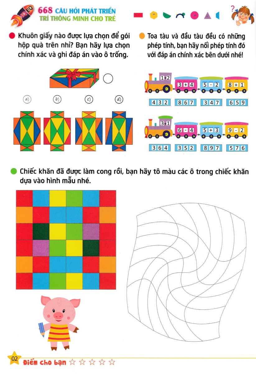 Bộ sách 668 Câu Hỏi Phát Triển Trí Thông Minh Cho Trẻ nhằm phát triển IQ,EQ, Cung cấp những trò chơi toán học úp trẻ phát huy tối đa khả năng nhận thức, tư duy phân kỳ, tưởng tượng, tri giác về không gian, phán đoán, suy luận và thông minh cảm xúc giúp trẻ rèn luyện tư duy một cách toàn diện. Nhiều bài trong bộ sách được trang bị để có sự tương tác giữa bố mẹ và con cái, vừa nân cao năng lực tuy duy của mình vừa giúp trẻ phát triển các kỹ năng tư duy cần thiết để trẻ xây dựng kỹ năng, sự khéo léo, tính chính xác và rèn luyện độ kiên trì