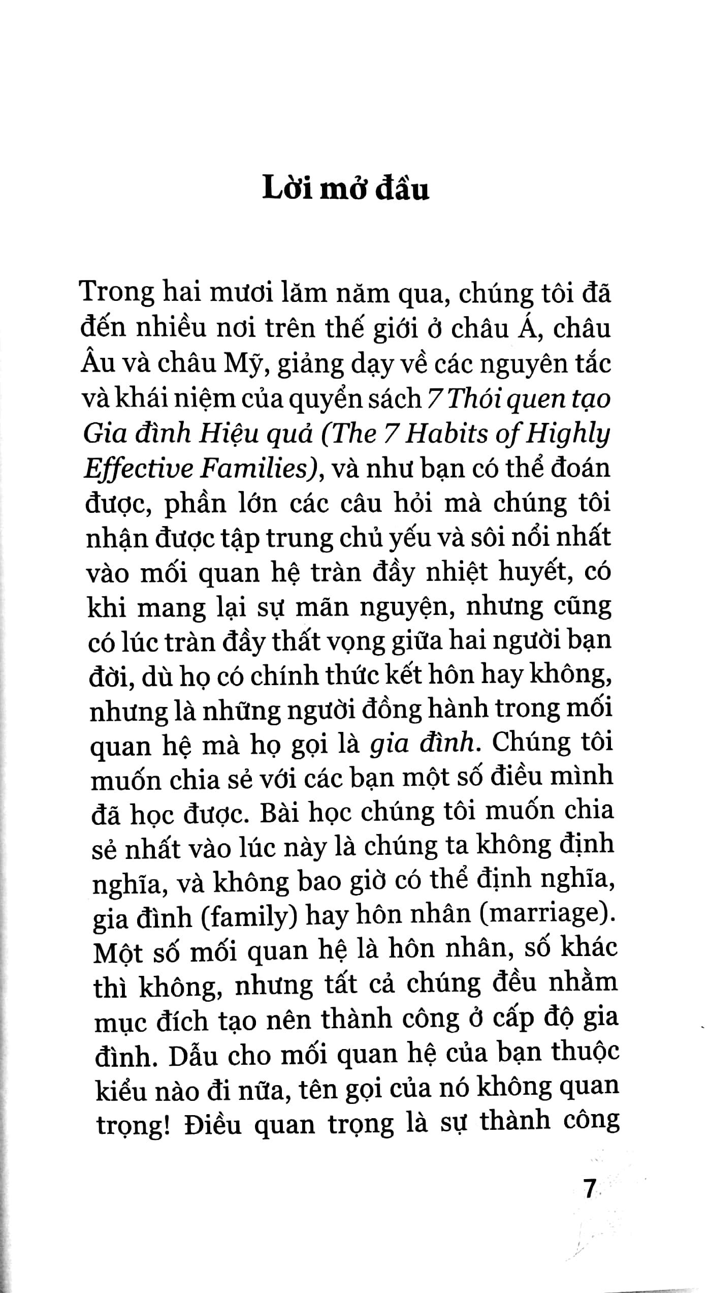 Thói quen 7: Rèn mới bản thân - rèn mới bản thân ở cả bốn chiều kích: thể chất, trí tuệ, tình cảm và tinh thần để duy trì “sức khỏe” cho bản thân và các mối quan hệ. Để hiểu rõ hơn về những nguyên lý cũng như 7 Thói quen, độc giả có thể kết hợp việc đọc quyển sách này cùng với quyển 7 Thói quen Hiệu quả. Hy vọng rằng quyển sách sẽ mang lại những giây phút học tập bổ ích và truyền cảm hứng để các bạn thực hành sống với 7 Thói quen trong mối quan hệ lứa đôi, hôn nhân và gia đình.