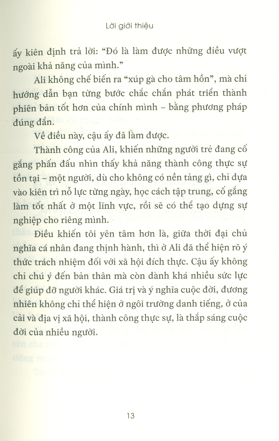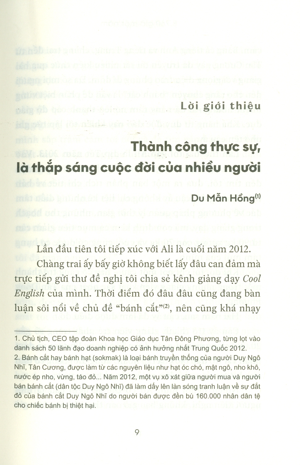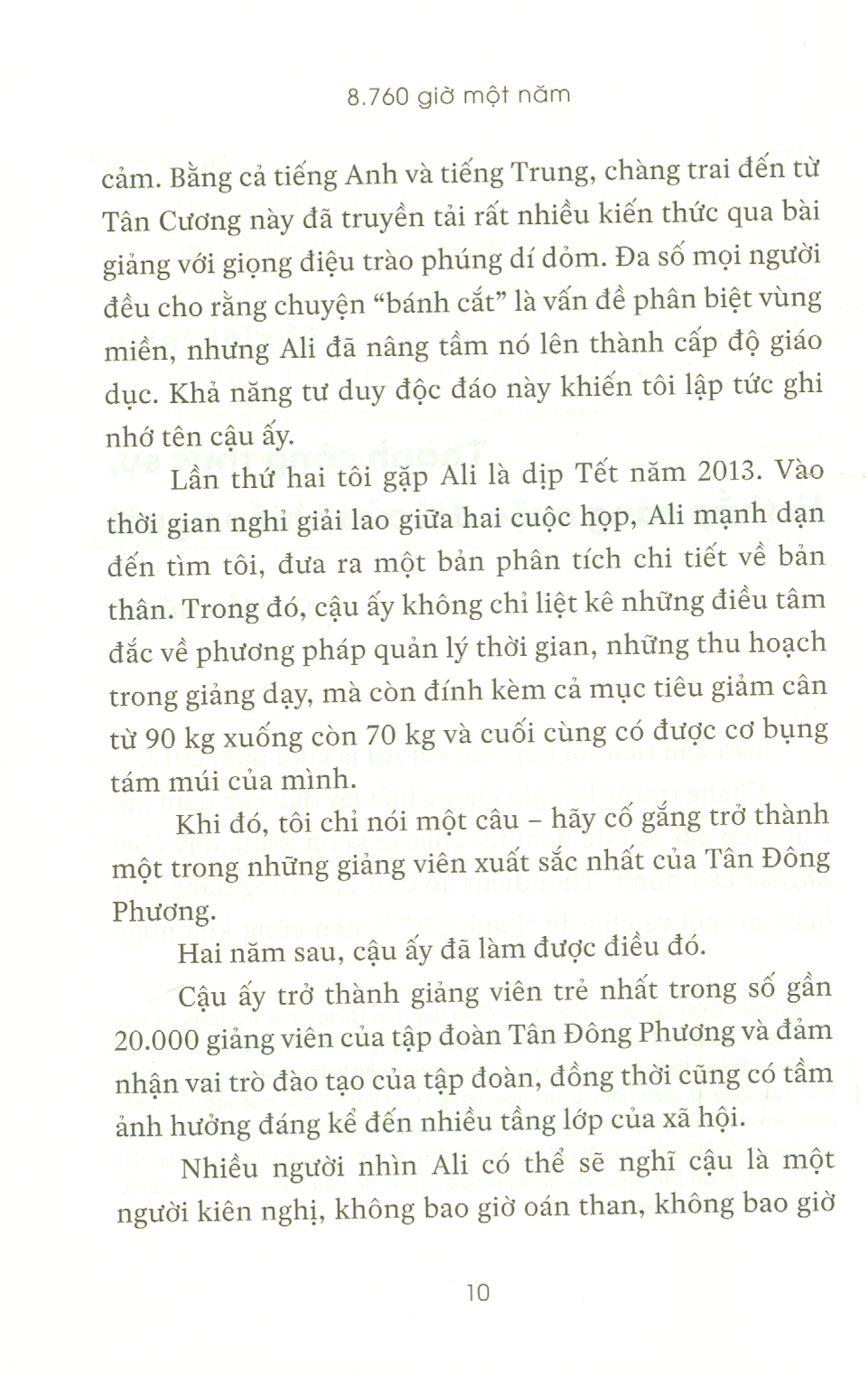 Ai cũng cần sức mạnh để lay động bản thân. Nhưng nếu một cuốn sách chỉ khiến bạn thấy cảm động, mà không dạy bạn về phương pháp, chứng tỏ nó chưa có ích nhiều cho bạn. Trong cuốn sách này, Ali đã mang tới nhiều phương pháp nhằm giúp bạn nâng cao chất lượng cuộc sống của mình, trong đó quan trọng nhất dường như là phương pháp quản lý thời gian cùng những công cụ được chứng minh có hiệu quả, có thể giúp ta vừa có đủ thời gian để nghỉ ngơi giải trí, vừa đảm bảo hoàn thành công việc và học tập trong khoảng thời gian ngắn nhất với chất lượng cao. Qua từng chương sách, bạn có thể bước từng bước nhỏ vững vàng, dần dần đi được xa hơn, đến gần hơn với ước mơ của mình. ALI tên thật là Nurali Abliz người dân tộc Duy Ngô Nhĩ, Tân Cương. Tốt nghiệp Đại học Bắc Kinh. Diễn thuyết gia và giáo viên tiếng Anh trực thuộc tập đoàn Tân Đông Phương, từng tham gia nhiều show truyền hình thực tế. Sáng tạo ra phương pháp quản lý thời gian 34 đồng tiền vàng giúp ích cho hàng trăm triệu người và app học tiếng Anh nổi tiếng Cool English với hơn 10 triệu lượt tải về trên appstore.