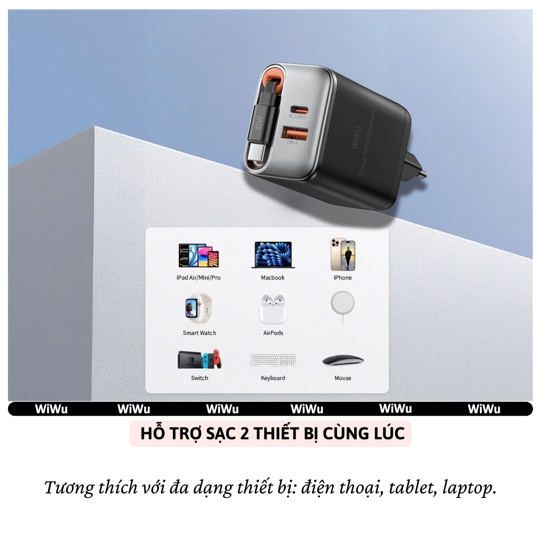 Bộ Sạc Nhanh GaN 67W WiWU Helix – Tích Hợp Dây Rút 70cm Nhỏ gọn – Siêu tốc – Chuẩn tiện lợi cho mọi hành trình! Bạn đã bao giờ gặp cảnh mang theo cả ổ sạc, dây sạc loằng ngoằng rồi lại quên mất đâu là đầu Type-C, đâu là củ sạc? WiWU Helix ra đời để dọn sạch đống rắc rối đó trong balo bạn. Điểm nổi bật của sản phẩm: Sạc siêu nhanh 67W – Công nghệ GaN hiện đại, truyền năng lượng hiệu quả, không nóng máy, bền bỉ theo thời gian. Tích hợp dây rút 70cm – Chỉ cần kéo nhẹ để dùng, thu gọn sau khi sạc – không còn lo dây rối hay thất lạc dây sạc. 2 cổng sạc (USB-C & USB-A) – Linh hoạt sạc cùng lúc nhiều thiết bị: điện thoại, tablet, tai nghe, sạc dự phòng,… Tương thích nhiều giao thức sạc nhanh (PD & QC) – Dù bạn dùng điện thoại hệ nào, WiWU Helix đều hỗ trợ tốc độ sạc tối ưu. Chip thông minh tích hợp – Tự động nhận diện thiết bị và điều chỉnh công suất phù hợp, bảo vệ pin và thiết bị khỏi quá nhiệt, quá dòng. Phù hợp cho: