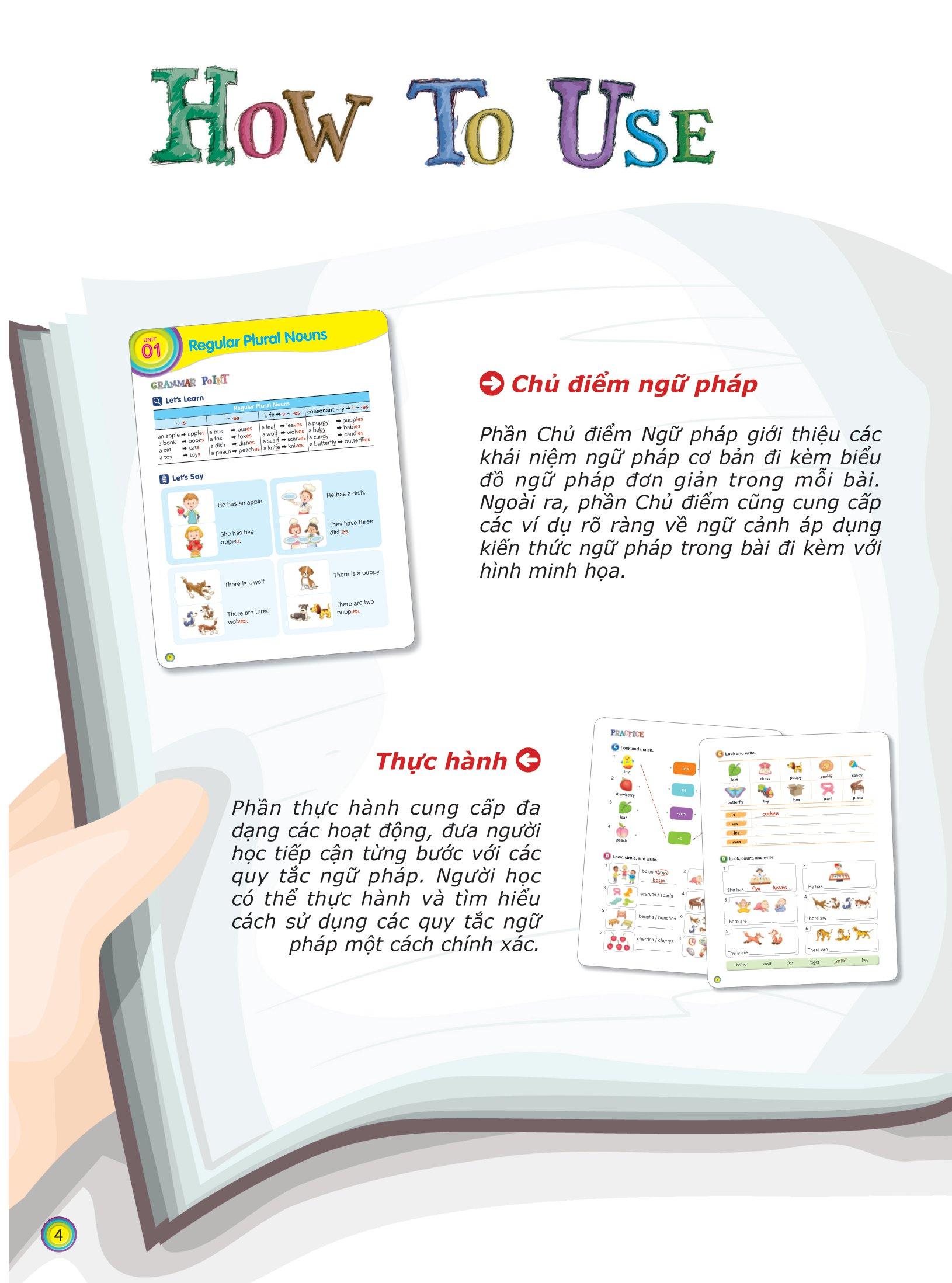- Phần thực hành cung cấp đa dạng các hoạt động, giúp các con tiếp cận từng bước với các quy tắc ngữ pháp. Các con có thể thực hành và tìm hiểu các quy tắc dử dụng ngữ pháp một cách chính xác.