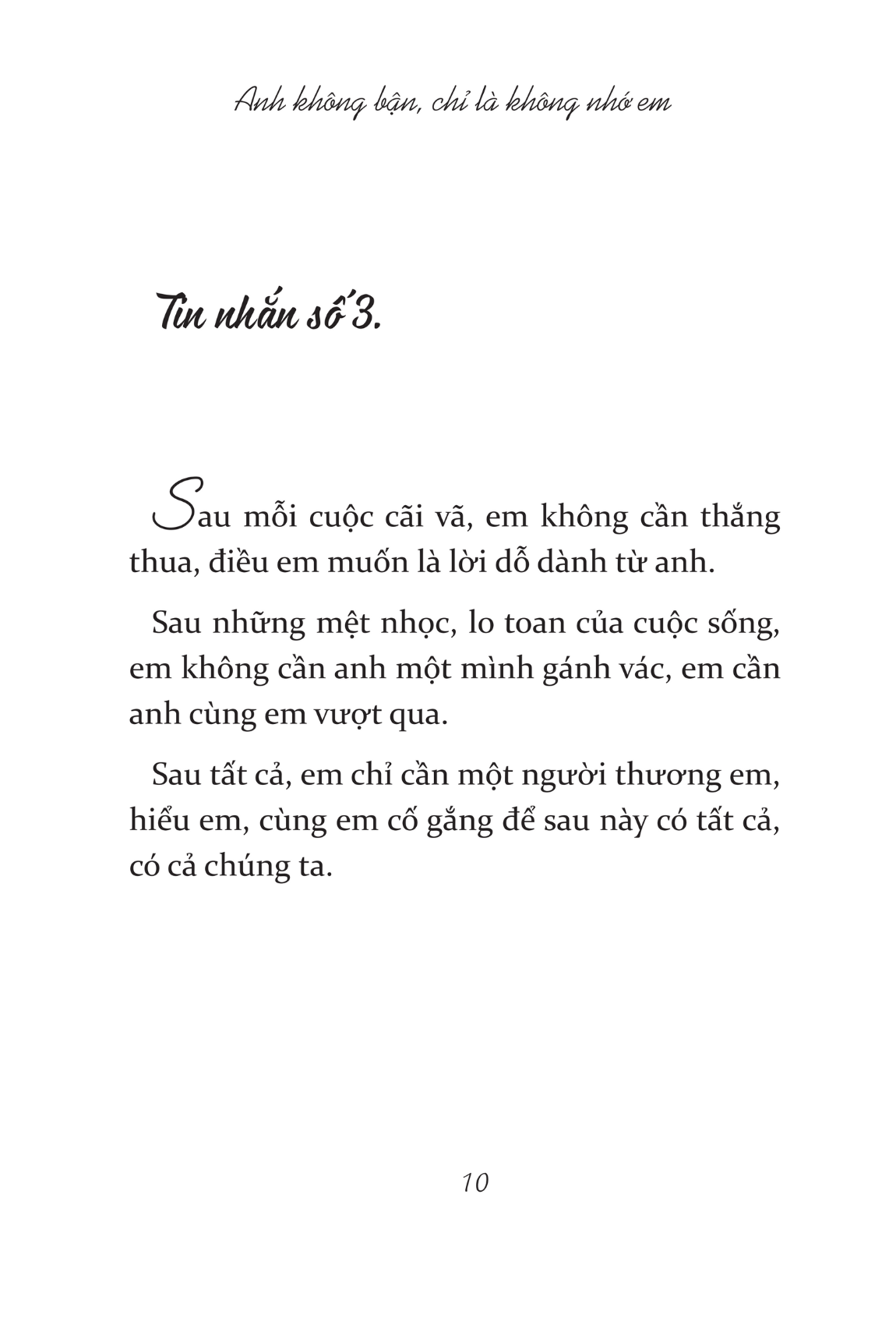 - Dành cho bạn, người quên yêu bản thân lúc vụn vỡ nhất “Một chuyện, cho dù đẹp đẽ tới đâu, nếu như không có kết quả thì cũng đừng bận tâm. Bởi vì lâu dần bạn sẽ thấy mệt. Một người, cho dù lưu luyến thế nào, nếu như không nắm giữ được thì cũng đừng cố chấp. Bởi vì lâu dần bạn sẽ thấy đau lòng.” Nhưng phải thừa nhận rằng, có đôi khi, từ bỏ cũng là một dạng nỗ lực. Yêu một người vô tâm sẽ là chuỗi những tủi hờn, buồn bã. Tuyệt vọng đến mức tự hứa không để mình đau khổ thêm một lần nào nữa nhưng vì còn yêu, còn vương vấn mà không thực hiện được. Anh ấy không dỗ dành, bạn phải tự mình vượt qua. Anh ấy không quan tâm, bạn chẳng có quyền đòi hỏi. Anh ấy không hồi đáp, bạn chẳng có tư cách mà đau lòng. “Em nhìn thấy sự thật, em biết tất cả mọi chuyện… Nhưng em không nói ra, vì em sợ nếu như nói ra hết mọi thứ thì mối quan hệ của chúng ta cũng sẽ tan vỡ. Em biết sự thất khiến em đau lòng, nhưng để mất đi mối quan hệ này có lẽ em sẽ đau lòng hơn…” “Anh không bận, chỉ là không nhớ em” - cuốn sách không phải là những câu chuyện tình yêu lãng mạn, những đoạn tình trọn vẹn hay dang dở mà bạn đang tìm kiếm. Mỗi trang sách như cuốn nhật ký ghi chép vụn vặt xúc cảm của một người đã yêu, đã chia tay và đã từng trải qua đổ vỡ. Với lời văn thủ thỉ nhẹ nhàng, bình dị, có lẽ bạn sẽ tìm thấy lời giải đáp cho câu chuyện của bản thân khi đọc cuốn sách này. “Anh không bận, chỉ là không nhớ em” – thương tặng các cô gái, hãy mạnh mẽ và can đảm bước ra khỏi mối tình đang khiến mình đau đớn. Nếu mệt quá thì hãy nghỉ ngơi một chút, rồi sẽ có người dịu dàng đến và dùng sự chân thành để chữa lành những vết xước trong lòng bạn thôi.