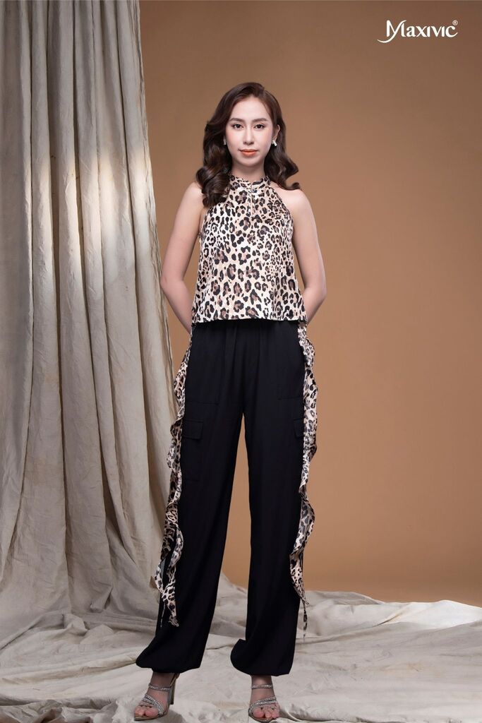 - Thiết kế kiểu áo cổ yếm và 2 dây tua rua nữ tính, kết hợp cùng hoạ tiết da báo mang lại diện mạo cá tính, trẻ trung và thu hút.