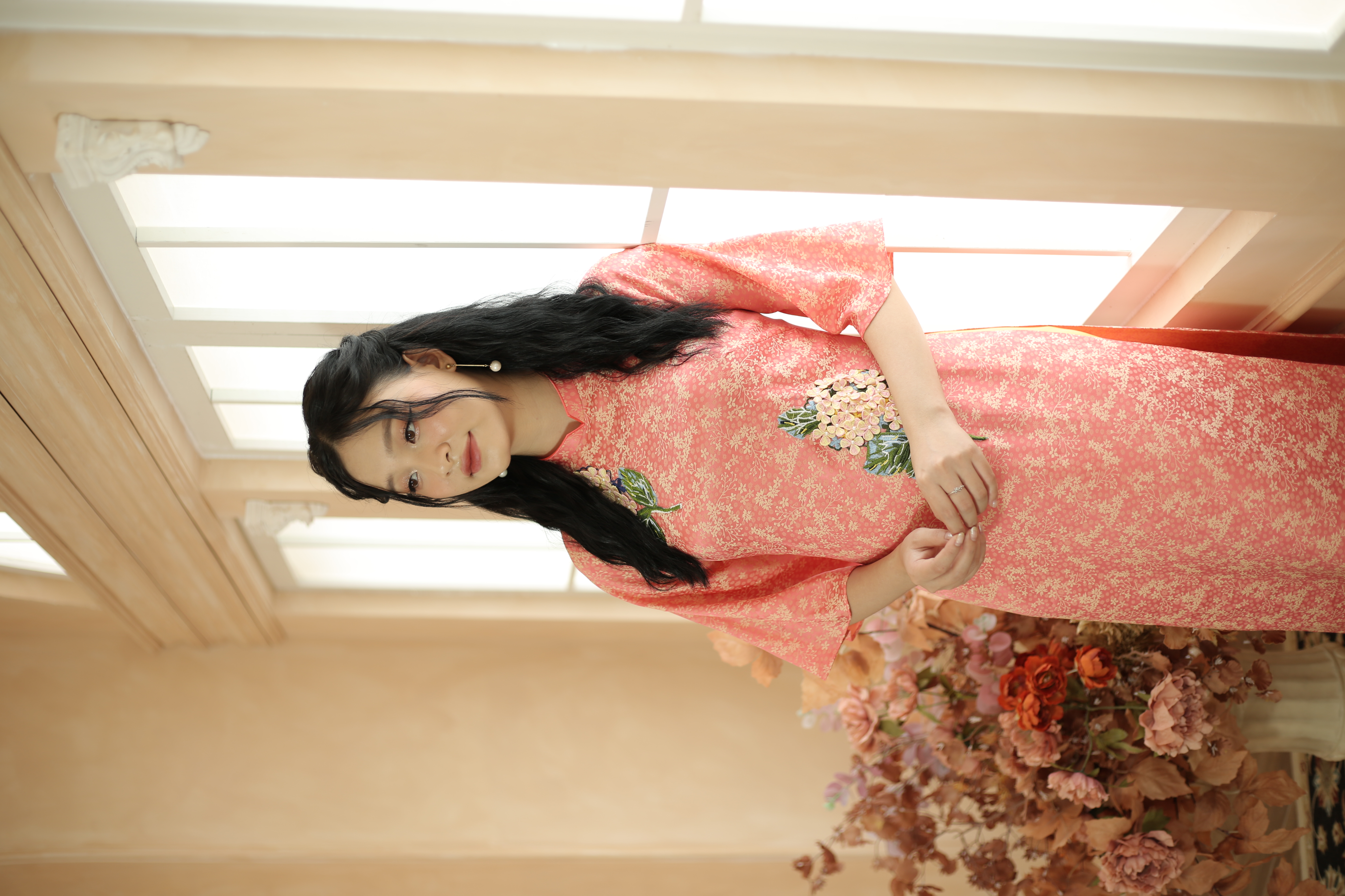 Áo dài form suông đỏ đô may bằng chất liệu lụa gấm loại 1 kết hoa và chim, tay lỡ loe, quần lụa hồng nhạt