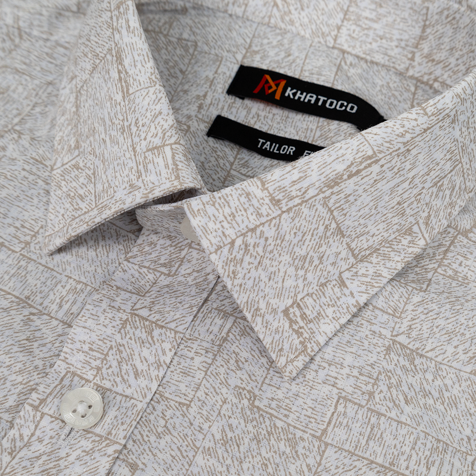 (V) Mô tả sản phẩm: Áo Sơ Mi Nam Khatoco Tay Ngắn – Họa Tiết Trừu Tượng, Form Tailor Fit Lịch lãm, thời thượng và đầy cá tính – mẫu áo sơ mi tay ngắn Khatoco là lựa chọn lý tưởng cho quý ông hiện đại. Thiết kế họa tiết trừu tượng ấn tượng trên nền vải trắng ngà, tạo điểm nhấn nổi bật nhưng vẫn giữ sự tinh tế. - Chất liệu: Polyester - Spandex - Viscose: mềm mại, thoáng mát, co giãn nhẹ, giữ form tốt và dễ ủi. - Kiểu dáng: Tailor Fit – ôm nhẹ cơ thể, giúp tôn dáng mà vẫn thoải mái vận động. - Thiết kế: - Cổ áo đứng chuẩn dáng, thanh lịch - Họa tiết trừu tượng độc đáo, hiện đại - Logo thêu tinh tế trên túi ngực - Nút áo tông xuyệt tông, được may chắc chắn - Màu sắc: Trắng ngà phối họa tiết nâu nhạt - Size: M (40), L (41), XL (42), 2XL (43)
