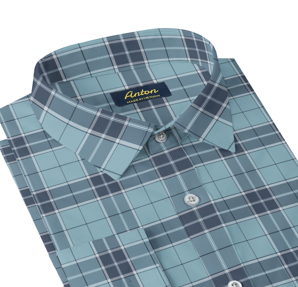 Khởi động ngày mới cùng Thời trang Khatoco Áo sơ mi kẻ caro xanh trắng với sự kết hợp màu sắc hài hòa giữa xanh trời nhẹ nhàng, chút trắng tinh tế đem lại sự