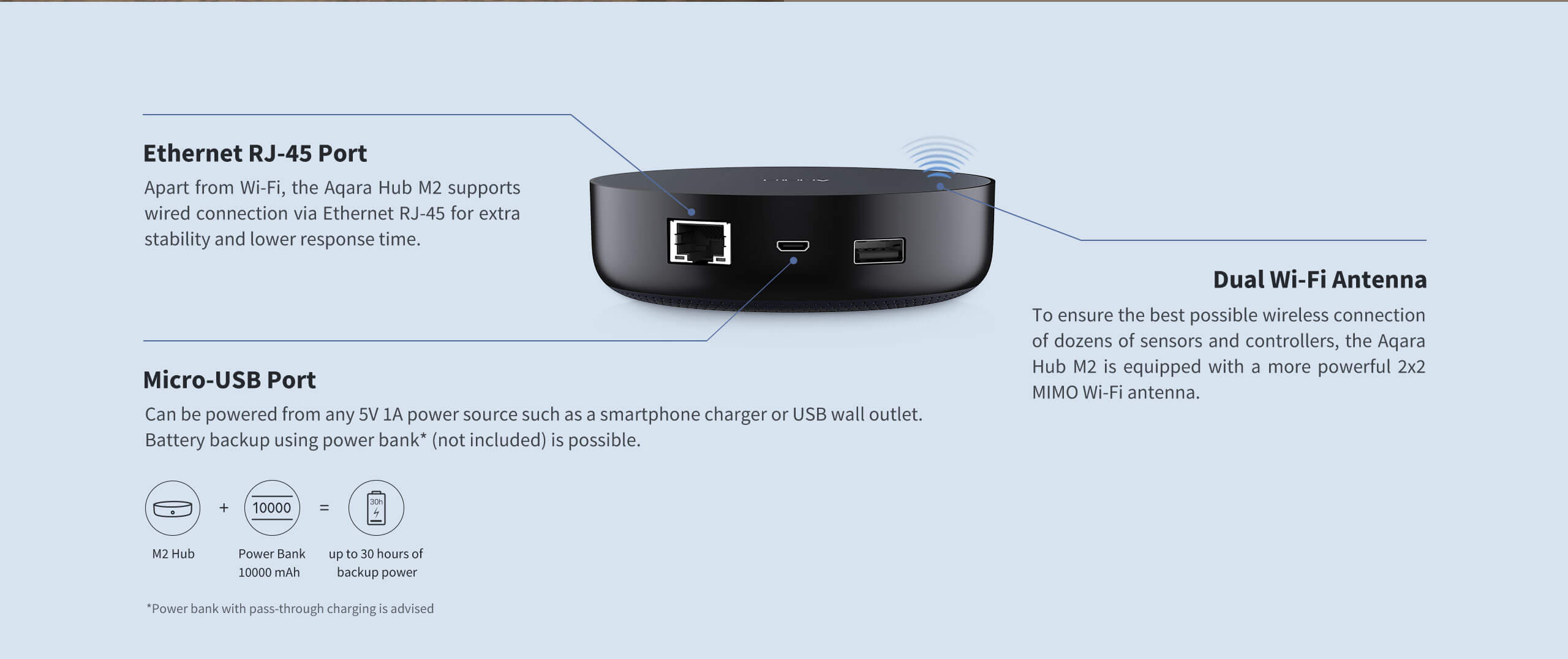 - Bảo mật cao. Công nghệ ăng ten kép MIMO tiên tiến nhất Để đảm bảo kết nối không dây tốt nhất có thể với hàng chục thiết bị cảm biến và bộ điều khiển, Aqara Hub M2 được trang bị ăng ten Wifi 2×2 MIMO tiên tiến nhất. Chính vì thế Aqara Hub M2 sẽ có khả năng bắt tín hiệu với thiết bị con tốt hơn phiên bản tiền nhiệm. Độ bao phủ lên đến 200m. Đồng thời, Hub M2 còn có kết nối dây từ cổng Ethernet RJ45 vào bộ định tuyến tăng sự đảm bảo thiết bị hoạt động ổn định. Và đây cũng là yếu tố khiến người dùng yêu thích phiên bản này. Cổng Micro-USB có thể được cấp nguồn từ bất kỳ nguồn điện 5V 1A nào như bộ sạc điện thoại thông minh hoặc ổ cắm USB trên tường. Hỗ trợ Apple HomeKit Không chỉ hoạt động với các sản phẩm đến từ Aqara hay Mijia, Aqara Hub M2 còn được coi là trung tâm đầu não của các thiết bị thuộc nền tảng nhà thông minh Apple HomeKit. Qua đó bạn có thể điều khiển thiết bị bằng giọng nói với Siri trên iPhone, iPad, Apple Watch hoặc ; tạo các ngữ cảnh tự động hóa, sử dụng ứng dụng Home điều khiển trung tâm nhà thông minh. Khi về nhà, chỉ cần nói “I’m home”, và TV sẽ được bật, âm nhạc tự động phát ra từ … một trải nghiệm cool rất đáng để thử. HomeKit cung cấp khả năng bảo mật cao cấp với mã hóa và xác thực đầu cuối. Các dữ liệu liên quan đến nhà của bạn sẽ được mã hóa và lưu trữ trong keychain của thiết bị Apple. Việc truyền nhận dữ liệu giữa thiết bị Apple với các thiết bị thông minh trong nhà bạn cũng được bảo mật triệt để. Ngữ cảnh thông minh Cùng với những thiết bị nhà thông minh Aqara khác, bạn có thể tạo ra không giới hạn các ngữ cảnh giúp cuộc sống thêm tiện nghi, thoải mái: