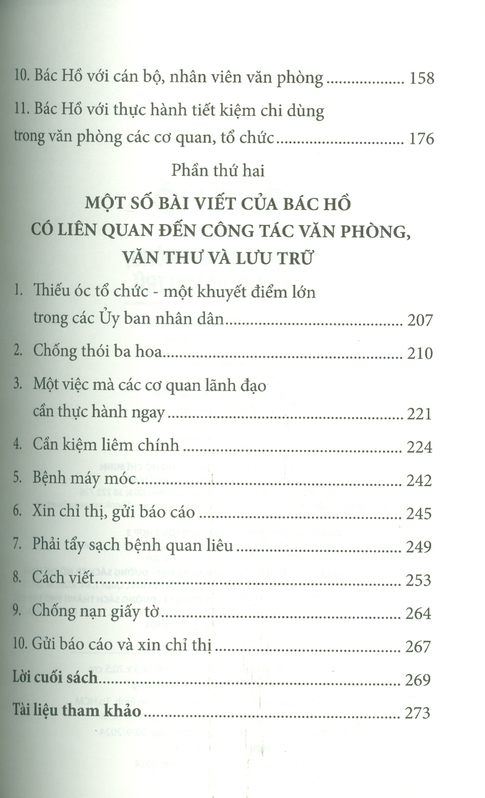 Phần thứ hai là tập hợp một số bài viết của Bác Hồ có liên quan đến công tác văn phòng, văn thư và lưu trữ như: óc tổ chức công việc trong hoạt động của Ủy ban nhân dân các cấp, về chống thói ba hoa, bệnh quan liêu, nạn giấy tờ, về cần kiệm liêm chính… Bác Hồ nói những điều đó trong nhiều hoàn cảnh lịch sử khác nhau nhưng đến tận ngày nay vẫn còn nguyên giá trị thời sự, nhất là khi công cuộc cải cách nền hành chính ở nước ta đang được đẩy mạnh để làm cho hoạt động quản lý nhà nước hiệu quả hơn. Bằng cách dẫn ra những lời nhắc nhở của Bác Hồ và những thành tựu nghiên cứu của nhiều nhà khoa học về công việc văn phòng, tác giả đã giúp người đọc hiểu một cách đầy đủ hơn về những công việc thầm lặng, nhưng rất có ý nghĩa thuộc lĩnh vực văn phòng, văn thư và lưu trữ.