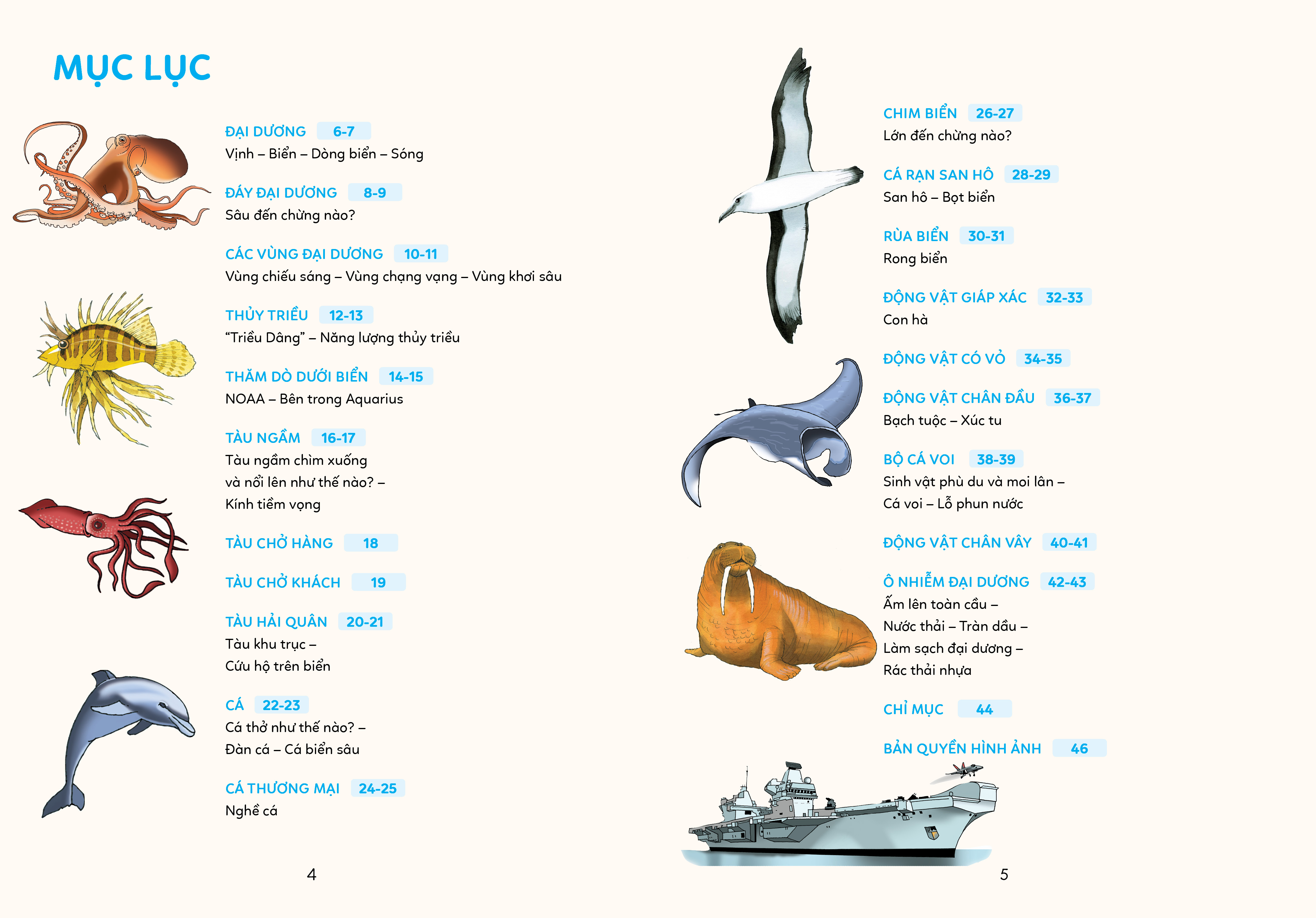 Đại dương có vô vàn sự sống và nhiều điều kỳ thú. Cuốn sách nói về những chủ đề chính như địa lý, lịch sử tự nhiên, công cuộc thăm dò và hoạt động của con người trong công cuộc khám phá và chinh phục đại dương bao la gồm: Biển – vịnh – Dòng biển – Sóng – Đáy đại dương – Các vùng đại dương – Thủy triều – Thăm dò dưới biển – Tàu ngầm – Kính tiềm vọng – Cứu hộ trên biển – Các loại cá – Chim biển – Cá rạn san hô – Rùa biển – Rong biển – Động vật giáp xác – Động vật có vỏ – Động vật chân đầu – Bộ Cá voi – Sinh vật phù du – Động vật chân vây – Ô nhiễm đại dương – Ấm lên toàn cầu – Nước thải – Tràn dầu – Làm sạch đại dương – Rác thải nhựa...
