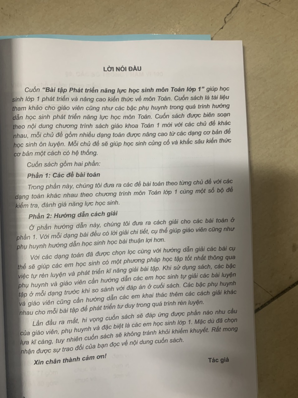 THÔNG TIN CHI TIẾT Công ty phát hành Huy Hoàng Tác giả TS Phạm Văn Công Nhà xuất bản NXB Đại Học Quốc Gia Hà Nội Năm xuất bản 2020 Kích thước 19 x 27 cm Số trang 126 Hình thức Bìa Mềm GIỚI THIỆU SÁCH Cuốn “Bài tập Phát triển năng lực học sinh môn Toán lớp 1” giúp học sinh lớp 1 phát triển và nâng cao kiến thức về môn Toán. Cuốn sách là tài liệu tham khảo cho giáo viên cũng như các bậc phụ huynh trong quá trình hướng dẫn học sinh phát triển năng lực học môn toán. Cuốn sách được biên soạn theo nội dung chương trình sách giáo khoa Toán 1 mới với các chủ đề khác nhau, mỗi chủ đề gồm nhiều dạng toán được nâng cao từ các dạng cơ bản để học sinh ôn luyện. Mỗi chủ đề sẽ giúp học sinh củng cố và khắc sâu kiến thức cơ bản một cách có hệ thống. Cuốn sách gồm hai phần: Phần 1: Các đề bài toán Trong phần này, chúng tôi đưa ra các đề bài toán theo từng chủ đề với các dạng toán khác nhau theo chương trình môn Toán lớp 1 cùng một số bộ đề kiểm tra, đánh giá năng lực học sinh. Phần 2: Hướng dẫn cách giải Ở phần hướng dẫn này, chúng tôi đưa ra cách giải cho các bài toán ở phần 1. Với mỗi dạng bài đều có lời giải chi tiết, cụ thể giúp giáo viên cũng như phụ huynh hướng dẫn học sinh học bài thuận lợi hơn. Với các dạng toán đã được chọn lọc cùng với hướng dẫn giải các bài cụ thể sẽ giúp các em học sinh có một phương pháp học tập tốt nhất thông qua việc tự rèn luyện và phát triển kĩ năng giải bài tập. Khi sử dụng sách, các bậc phụ huynh và giáo viên cần hướng dẫn các em học sinh tự giải các bài luyện tập ở mỗi dạng trước khi so sánh với đáp án ở cuối sách. Các bậc phụ huynh và giáo viên cũng cần hướng dẫn các em khai thác thêm các cách giải khác nhau cho mỗi bài tập để phát triển tư duy trong quá trình rèn luyện Lần đầu ra mắt, hi vọng cuốn sách sẽ đáp ứng được phần nào nhu cầu của giáo viên, phụ huynh và đặc biệt là các em học sinh lớp 1. Mặc dù đã chọn lựa kĩ càng, tuy nhiên cuốn sách sẽ không tránh khỏi khiếm khuyết. Rất mong nhận được sự trao đổi của bạn đọc về nội dung cuốn sách. Xin chân thành cảm ơn! Tác giả