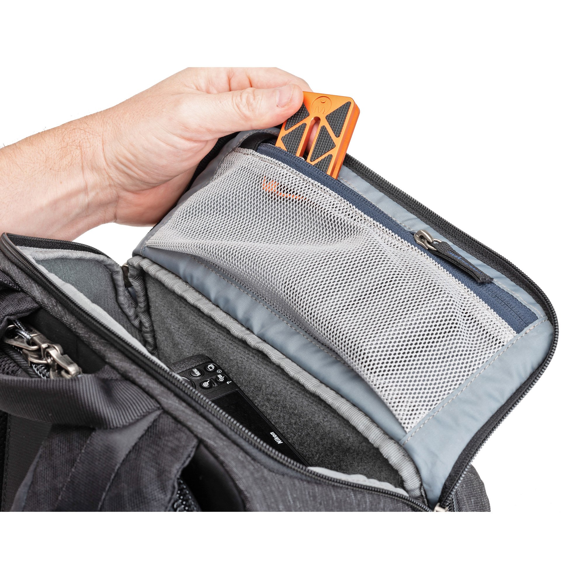 Balo máy ảnh Think Tank Backstory 13 với miệng túi chính ở vị trí phía sau giúp người dùng dễ dàng sắp xếp các thiết bị bên trong , cùng với ngăn phụ phía trên