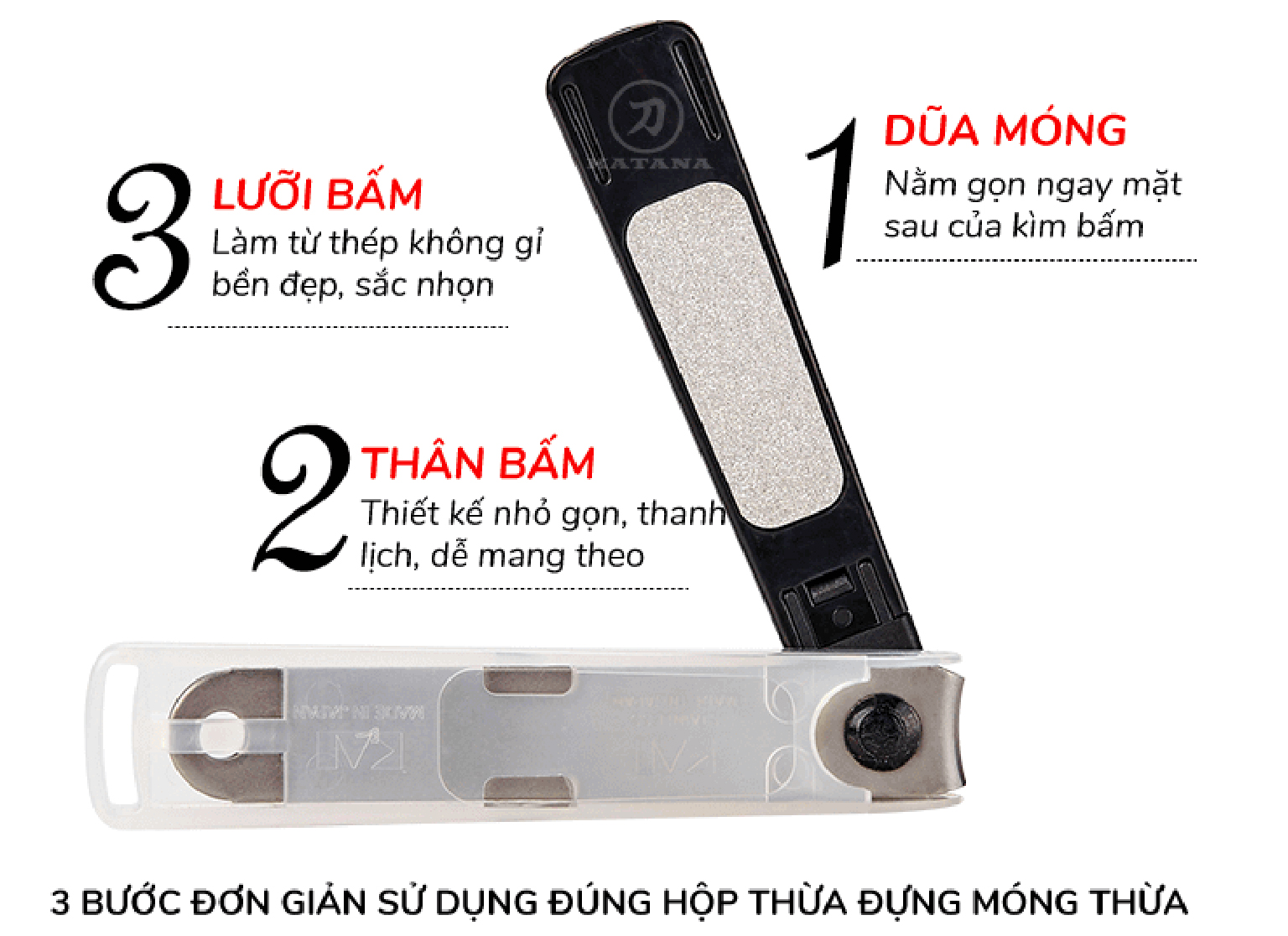 - Có khay đựng móng thông minh giúp móng sau khi được cắt không bị bắn tung tóe ra ngoài, gọn gàng & sạch sẽ.