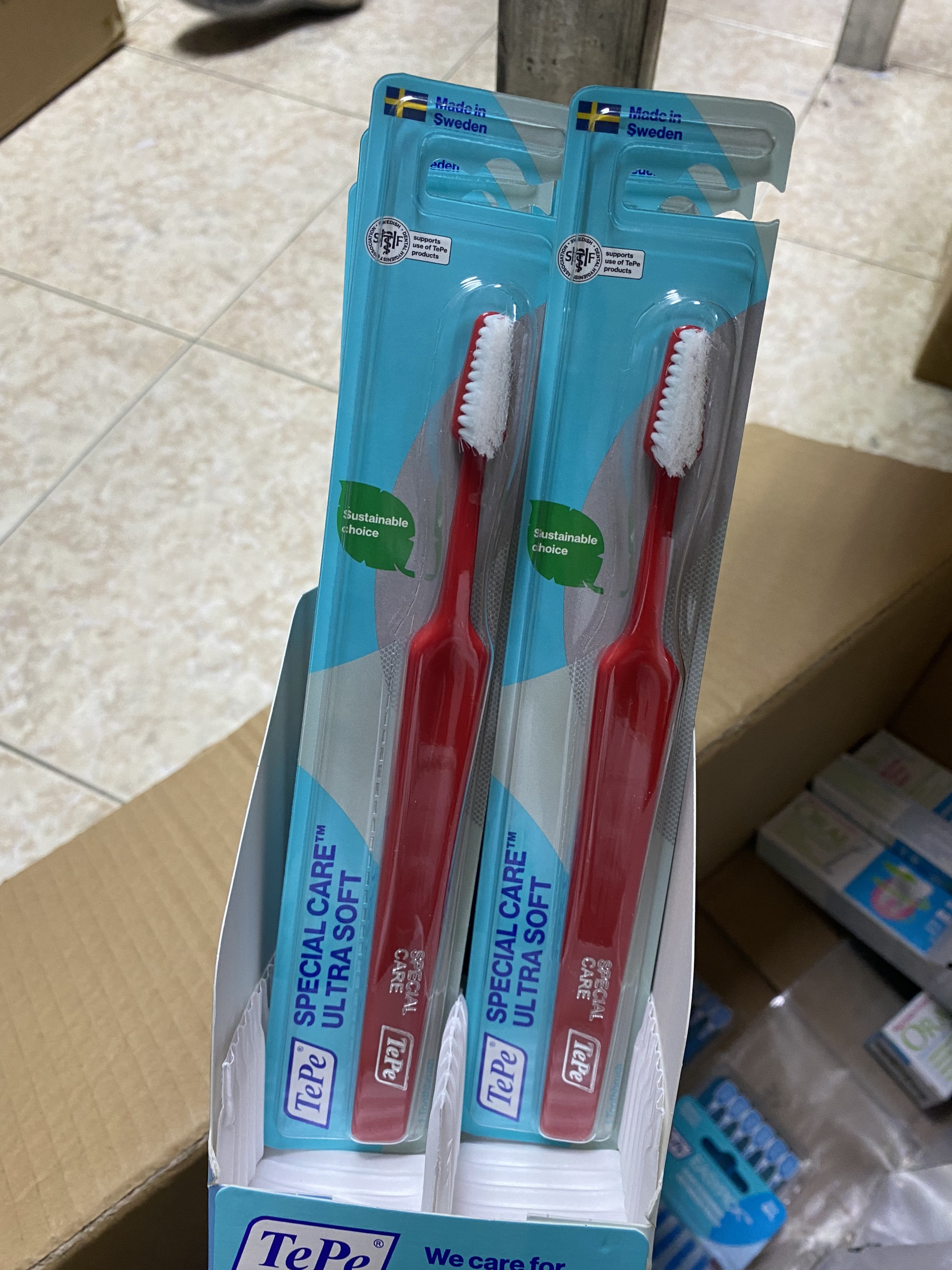 Bàn Chải Đánh Răng Siêu Mềm Sau Phẫu Thuật Răng Miệng – Tepe Special Care Mô tả sản phẩm Bàn chải đánh răng sau phẫu thuật Tepe Special Care sở hữu thiết kế đặc biệt với 12,000 sợi lông bàn chải siêu mềm, là sản phẩm được nha sĩ khuyên dùng dành cho những bệnh nhân vừa trải qua phẫu thuật nha khoa và những người đang ở trong tình trạng những mô mềm trong miệng bị sưng đau nghiêm trọng. Công dụng của bàn chải răng sau phẫu thuật Tepe Special Care TePe Special Care là bàn chải đánh răng với 12.000 sợi siêu mềm. Làm sạch tốt vùng kẽ răng nhưng kém hiệu quả hơn trong việc loại bỏ mảng bám trên răng và được khuyên dùng để chải sau khi phẫu thuật miệng và cho những bệnh nhân bị đau hoặc mô miệng rất mỏng, bề mặt chân răng rất nhạy cảm, miệng cực kỳ khô và sau xạ trị. Đối tượng nên dùng bàn chải răng sau phẫu thuật Tepe Special Care Khuyên dùng cho bệnh nhân sau khi phẫu thuật miệng và cho những bệnh nhân bị đau hoặc mô miệng rất mỏng, bề mặt chân răng rất nhạy cảm, miệng khô, viêm nướu do biến chứng của tiểu đường, hóa trị, xạ trị. Thông tin chi tiết của bàn chải răng sau phẫu thuật Tepe Special Care Model: Tepe Special Care Tên thương hiệu: Tepe Xuất xứ: Thụy Điển Thông tin thương hiệu TePe Được thành lập vào năm 1965 tại Thuỵ Điển, Tepe không ngừng nỗ lực hoàn thiện từ khâu thiết kế, nghiên cứu và phát triển sản phẩm, kiểm định, thử nghiệm, đánh giá hiệu quả sử dụng cho đến khâu sản xuất để trở thành một thương hiệu đi đầu trong lĩnh vực chăm sóc nha khoa phòng ngừa, trở thành một công ty sản xuất sản phẩm chăm sóc, vệ sinh răng miệng chất lượng cao, tính năng vượt trội hàng đầu thế giới, bắt kịp những xu hướng mới, đáp ứng đầy đủ mọi nhu cầu của người tiêu dùng và đòi hỏi của các chuyên gia trên thế giới.
