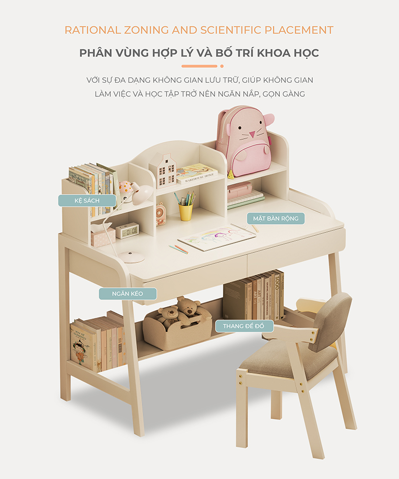 Công năng: Là mẫu bàn học cho trẻ em thiết kế hiện đại và đẹp mắt, sở hữu nhiều kệ và ngăn kéo giúp việc học của bé hiệu quả.