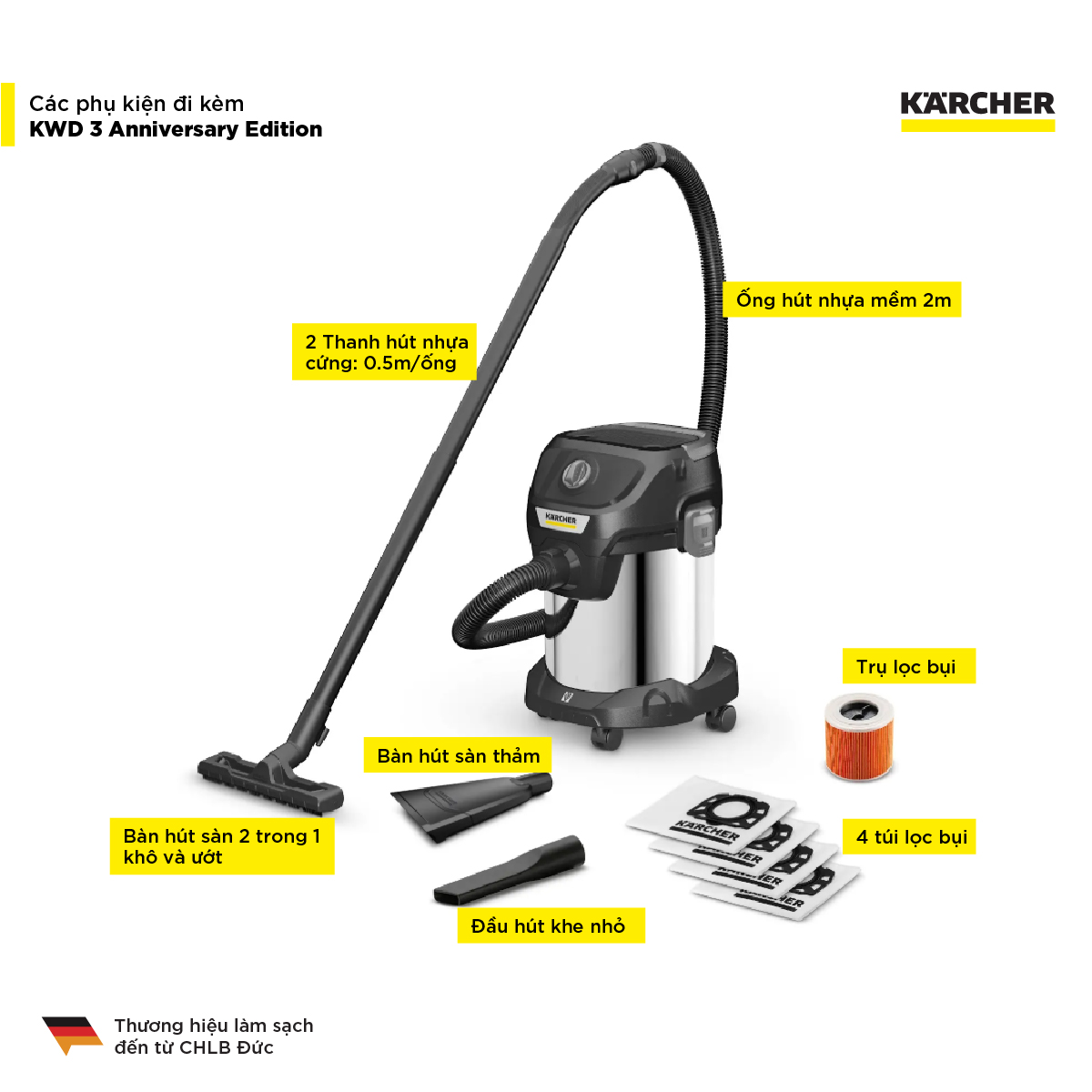 ✨[BẢN KỶ NIỆM GIỚI HẠN] Máy hút bụi đa năng khô và ướt Karcher KWD 3 S Anniversary - Sản xuất châu Âu - Công suất 1000W - Hàng Chính Hãng