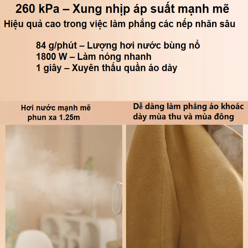 Hơi phun tăng cường lên tới 250 g giúp làm phẳng cả những nếp nhăn cứng đầu: Thâm nhập sâu hơn vào cấu trúc vải để loại bỏ ngay cả những nếp nhăn cứng đầu.