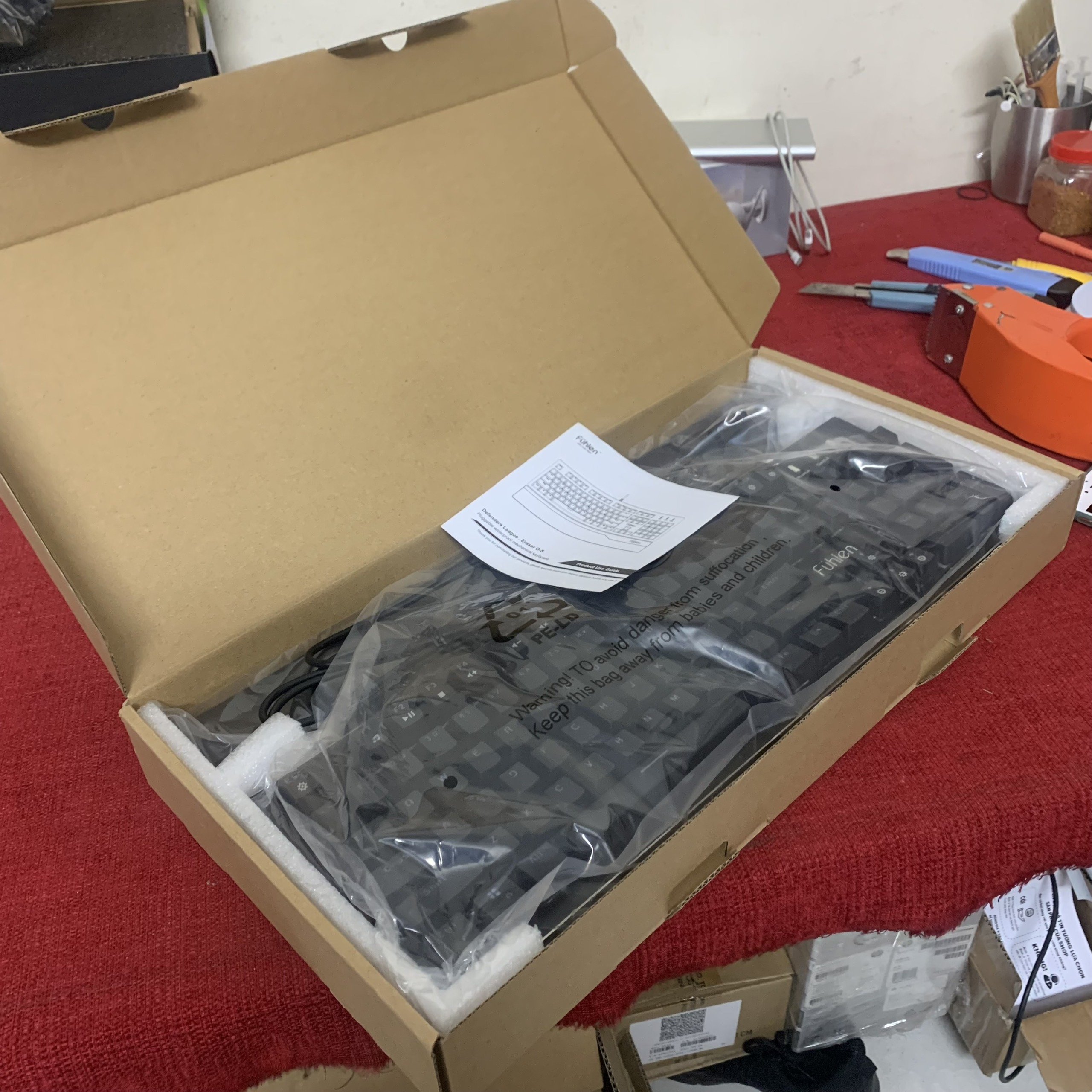 Bảo hành 2 năm, bao test 7 ngày THÔNG SỐ KỸ THUẬT Thương hiệu: Fuhlen Model: Eraser Mechanical Màu sắc: Đen Kết nối: Có dây Kiểu dáng: Fullsize 104 phím Kích thước bàn phím: 443 x 220.5 x 41mm Kích thước kê tay: 443 x 63 x 14mm Khối lượng: 1kg( bao gồm kê tay) Đèn led: LED RGB Rainbow Switch: Fuhlen Optical switch Dây: Dài 1,8m Chất liệu Nhựa. vỏ kim loại Phụ kiện: Sách HDSD, kê tay MÔ TẢ CHI TIẾT BÀN PHÍM FUHLEN ERASER FUHLEN ERASER MECHANICAL VỚI THIẾT KẾ ẤN TƯỢNG CAO CẤP Fuhlen E Eraser Mechanical là một trong số ít các dòng bàn phím fuhlen sở hữu bộ khung được làm bằng kim loại cứng được phủ lớp sơn đen chống tĩnh điện. Cùng với đó là được hãng sản xuất sử dụng keycap được thiết kế khá cao theo công nghệ Doubleshot có 2 lớp, các kí tự được chạm khắc ở cả mặt trong và mặt ngoài để đèn LED có thể xuyên qua phím. SỬ DỤNG SWITCH QUANG HỌC CẢM GIÁC BẤM TỐT Bàn phím cơ Fuhlen E (Eraser) với công nghệ Switch quang học không bị hiện tượng click đúp. Giúp đây là một trong những dòng bàn phím chơi game giá rẻ nhận tốc độ của phím rất nhanh, cảm giác bấm cũng như các nút nảy đều và cho phép nhận lệnh từ tất cả các phím cùng một lúc. Với cảm giác gõ Fuhlen Eraser mang đến cho người dùng cảm giác tương tự như Cherry switch trên các dòng bàn phím cơ đắt tiền ở phân khúc cao cấp. Nhưng tốc độ phản hồi tín hiệu nhanh hơn và theo một số thông tin từ Fuhlen xác nhận Eraser Mechanical Keyboard có tuổi thọ lên tới 50 triệu lượt nhấn. HỆ THỐNG LED RGB RAINBOW ẤN TƯỢNG, ĐẸP MẮT Led 7 màu bố trí thành các vùng riêng biệt Fuhlen Eraser có thiết kế và màu sắc không hề màu mè và phô trương. Tuy nhiên điểm nhấn lại là hệ thống Led 7 màu với nhiều hiệu ứng chuyển động bắt mắt, hiệu ứng led làm say mê người dùng công nghệ TRANG BỊ ĐI KÈM CAO CẤP, CHẤT LƯỢNG Dây bàn phím là dây cao su có cục chống nhiễu, đầu USB mạ vàng giúp truyền tín hiệu nhanh chóng. Được hãng sản xuất thiết kế và đi kèm với bàn phím Fuhlen Eraser E là bộ kê tay được thiết kế dài bằng bàn phím có các miếng cao su chống trượt. Đồng thời kê tay được sử dụng khá tốt nhằm hỗ trợ các game thủ sử dụng máy trong thời gian dài chống bị mỏi cổ tay. Tháo lắp rất nhanh chóng và gọn gàng.