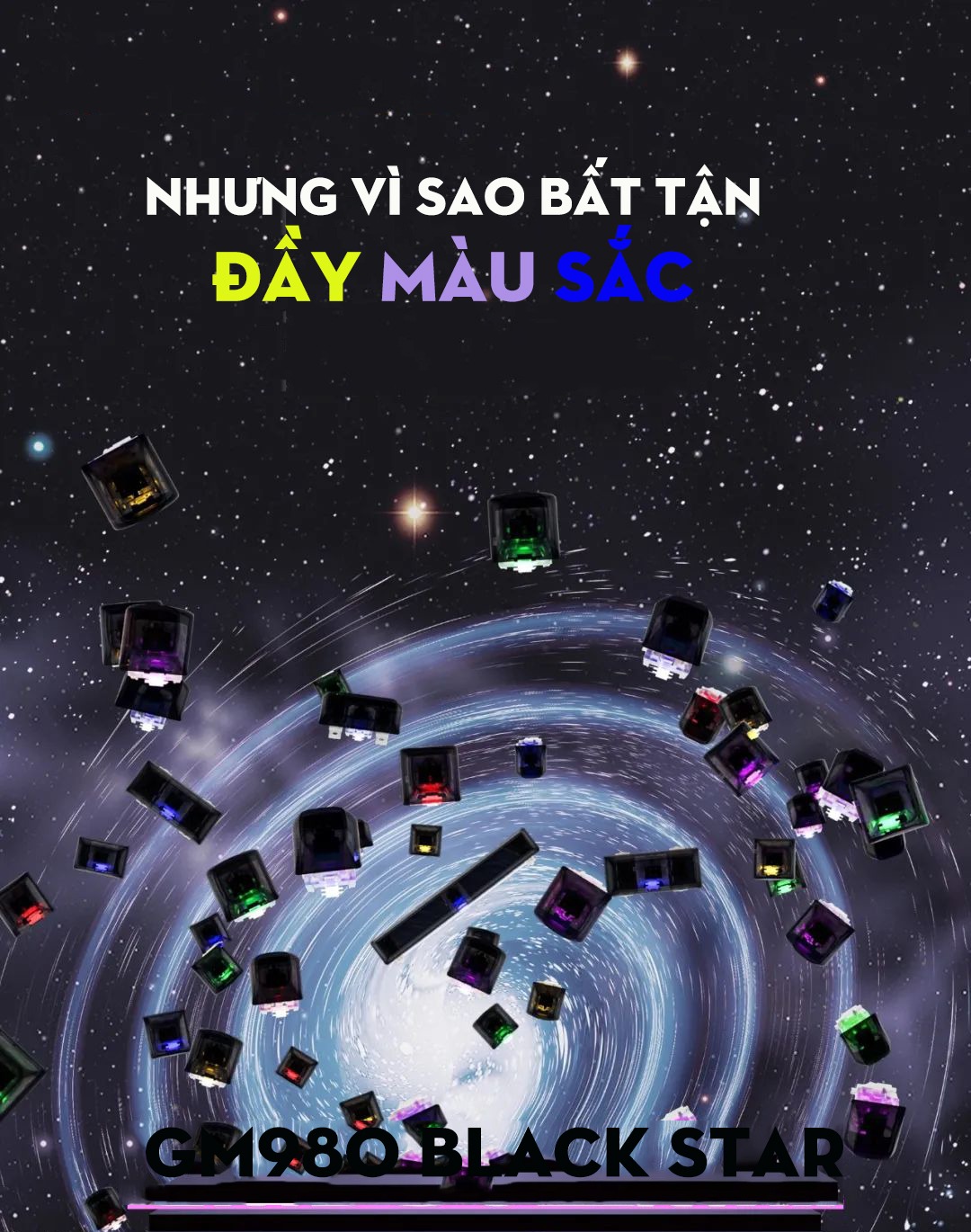 Tên sản phẩm : Ngôi sao đen GM980 Misty rain Số lượng phím: 100 Kích thước: 391*161*39mm Foam tiêu âm : Silicon 2 lớp Keycap: PC , ASA- Clear profile LED: 16.8 triệu mầu, 19 hiệu