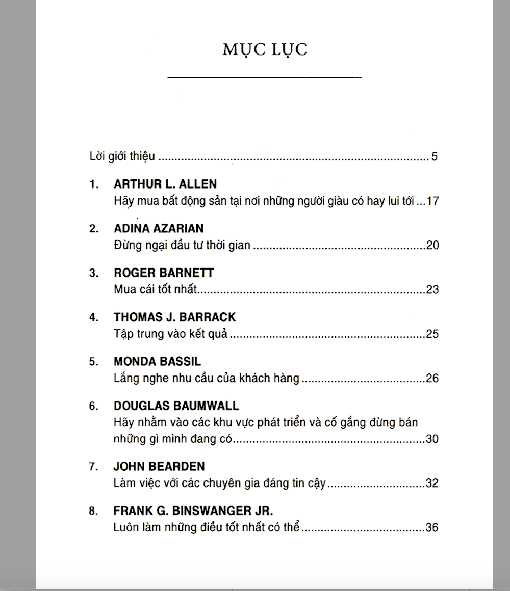 Trong số những người đóng góp cho cuốn sách này, có người là bạn tôi, cũng có người tôi chưa từng gặp mặt, dù tôi luôn ngưỡng mộ họ từ xa. Cuốn sách này là bản tóm tắt hoàn hảo nhất những lời khuyên trong kinh doanh bất động sản được thu thập từ trước tới nay. Và tôi cho rằng nó đã hoàn tất sứ mệnh của mình: cung cấp cho bạn những lời khuyên bổ ích, giúp bạn lập kế hoạch để chính mình thành công trong lĩnh vực bất động sản. Dù bạn mua hay bán nhà của bạn, nhà tập thể hoặc trả góp; dù bạn đang hoạt động hay mới bước chân vào lĩnh vực kinh doanh bất động sản, tôi nghĩ rằng bạn sẽ học được rất nhiều từ cuốn sách này.