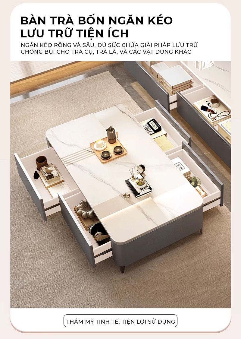- Công năng: Là mẫu bàn sofa phòng khách sang trọng với thiết kế bọc da quanh viền và mặt bàn màu vân đá hiện đại