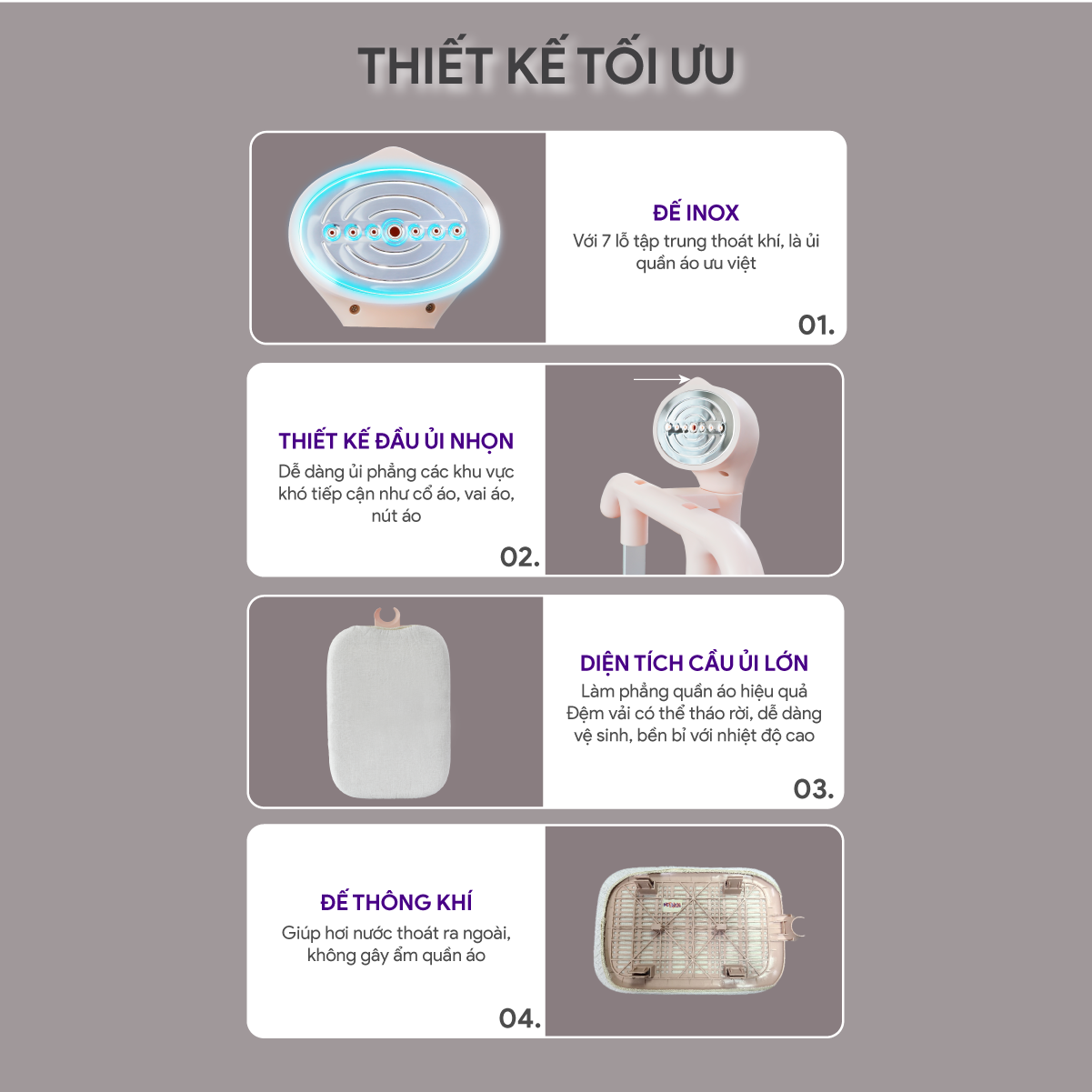 ĐẶC ĐIỂM NỔI BẬT - Thiết kế hiện đại, màu sắc trang nhã, dễ di chuyển và cất giữ. - Công suất 1800W, làm nóng nhanh, tiết kiệm thời gian ủi. - 3 mức điều