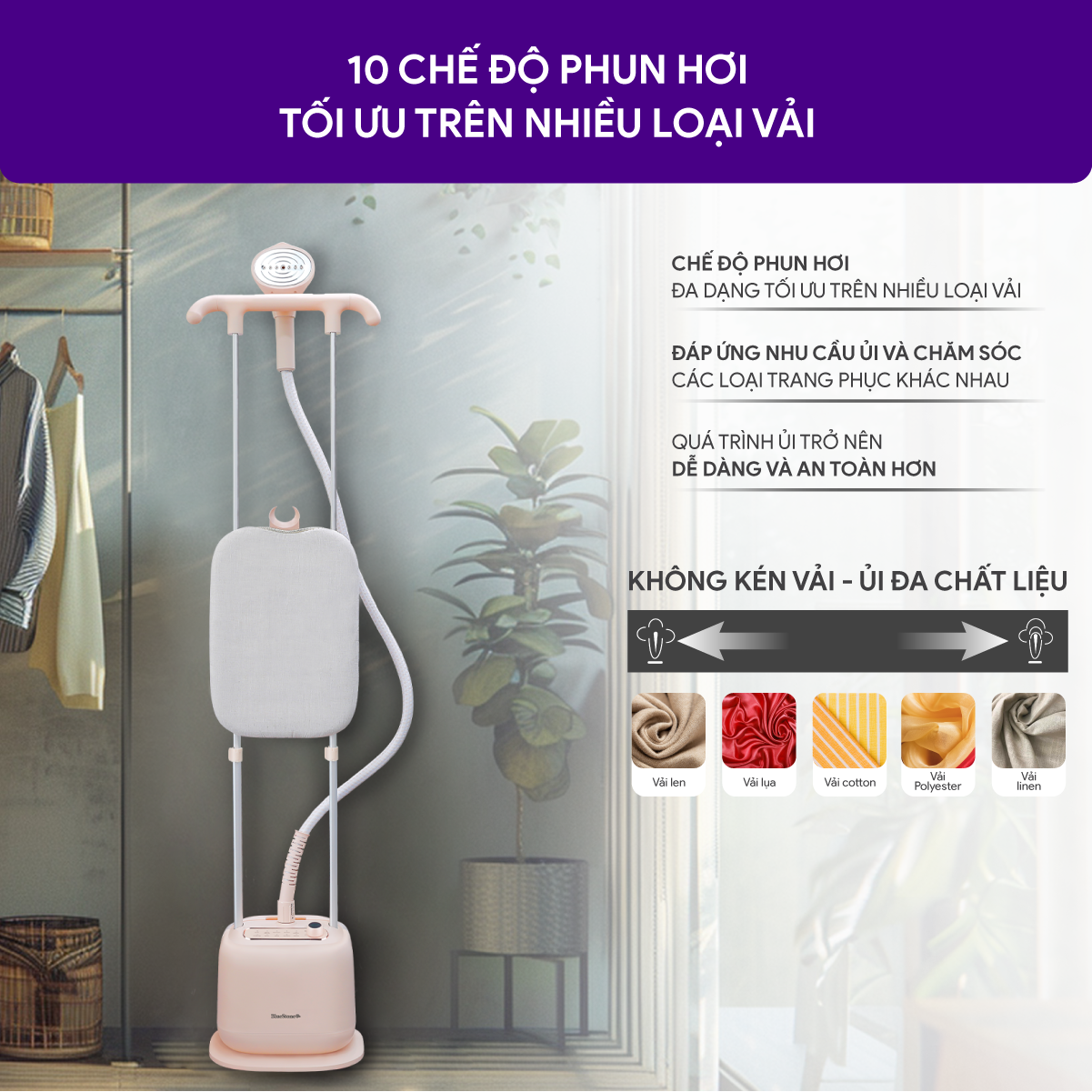 Bàn là 3 mức công suất: là được tất cả các loại vải từ tơ lụa tới vải dày như áo khoác dạ, cam kết không gây cháy Hơi nước được xả mạnh và liên