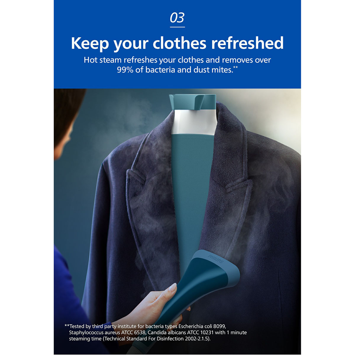 - Không chỉ giúp làm phẳng nhanh quần áo, tính năng phun hơi này còn giúp tiêu diệt đến 99.9% vi khuẩn và mồ hôi giúp quần áo luôn thơm mới. Tiện ích và tính năng an toàn