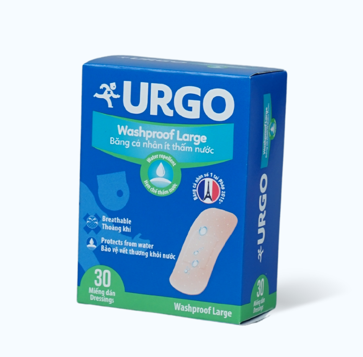 ✨Băng cá nhân ít thấm nước URGO Washproof Large bảo vệ vết thương khỏi nước 3.8cm x 7.2cm (30 miếng)