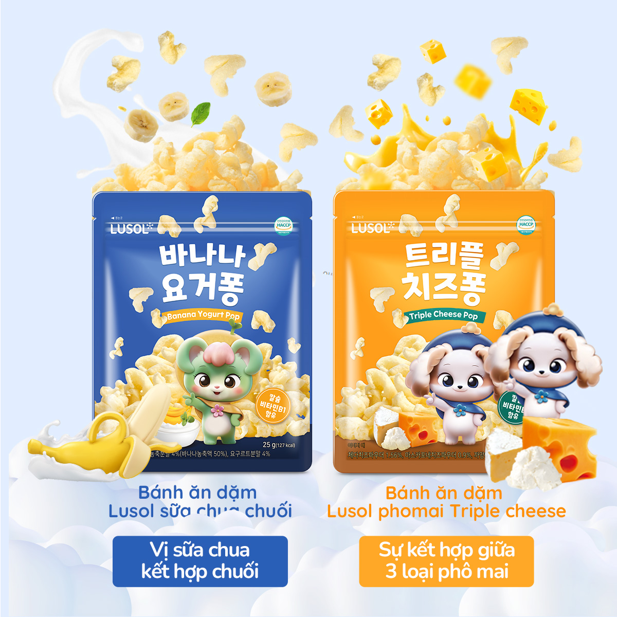 - Tên sản phẩm: Combo bánh ăn dặm Lusol – Vị sữa chua chuối & Triple Cheese