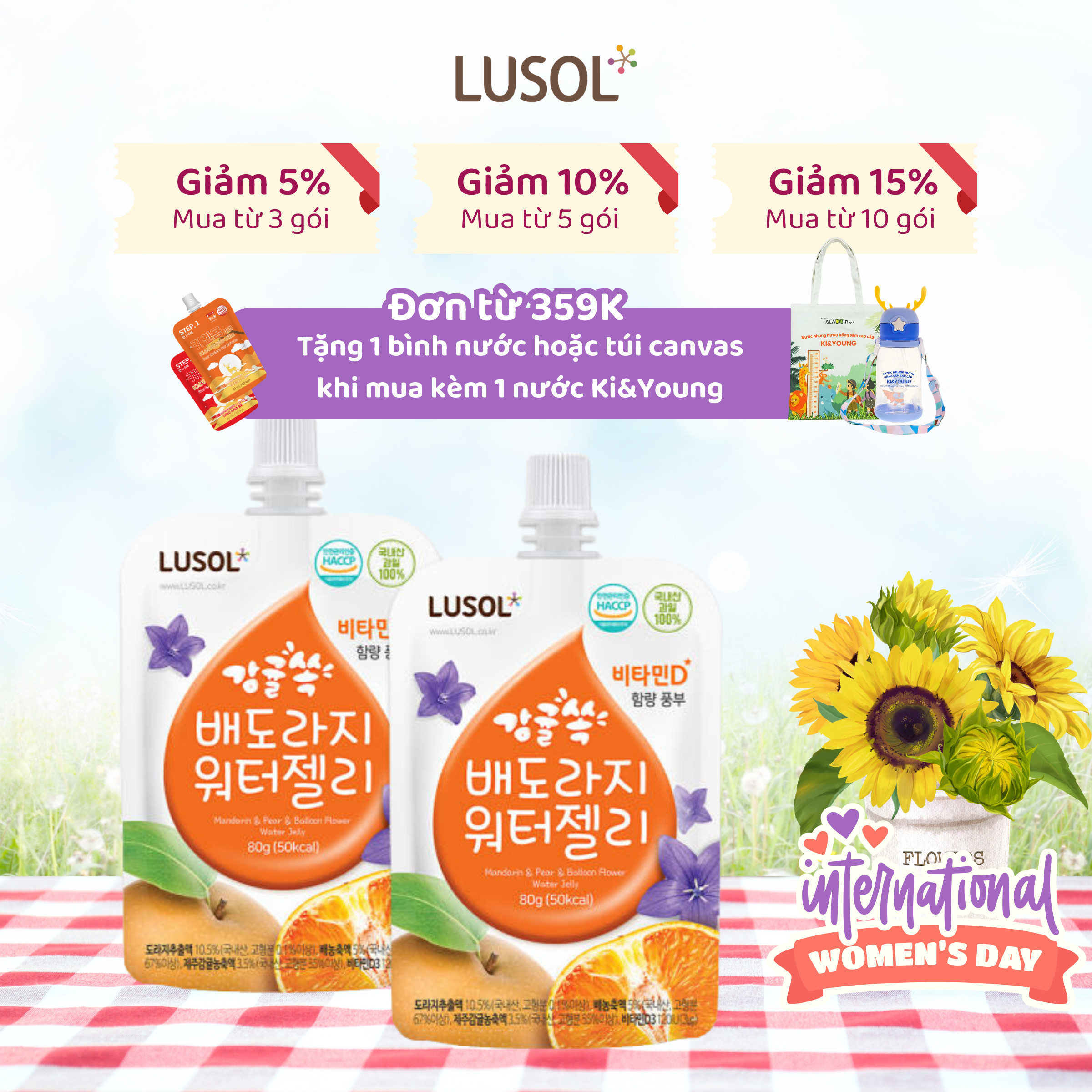 - Sản phẩm nước ép lê và rễ hoa chuông đen nguyên chất Lusol có thiết kế túi đựng có vòi, có thể sử dụng mọi lúc mọi nơi, vừa tay cầm của trẻ nhỏ, bé có thể tự uống dễ dàng. Tên sản phẩm: Nước thạch Lê, Quýt, Rễ hoa chuông đen Lusol cho bé từ 12 tháng tuổi. Hương vị: Lê, Quýt và Rễ hoa chuông đen. Trọng lượng: 80g/gói. Đặc điểm nổi bật: