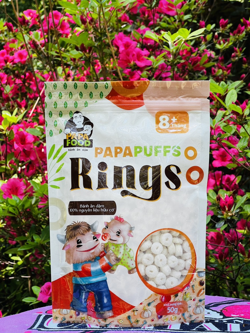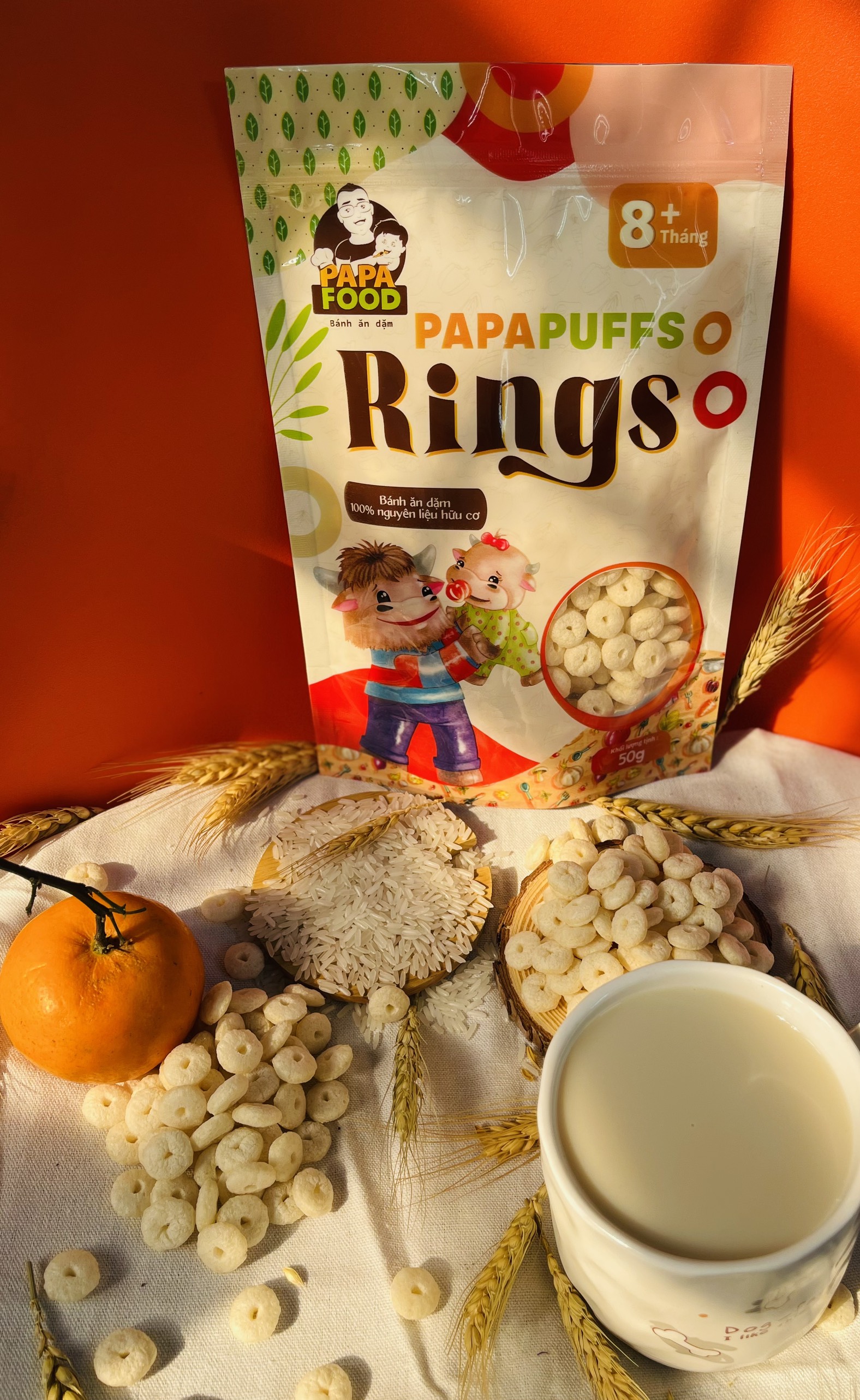 1. Tên sản phẩm: Bánh ăn dặm PAPAPUFFS RINGS - 100% Nguyên Liệu Hữu cơ 2. Thành phần: Sản phẩm được sản xuất từ 100% nguyên liệu hữu cơ gồm gạo lứt hữu cơ 70%,