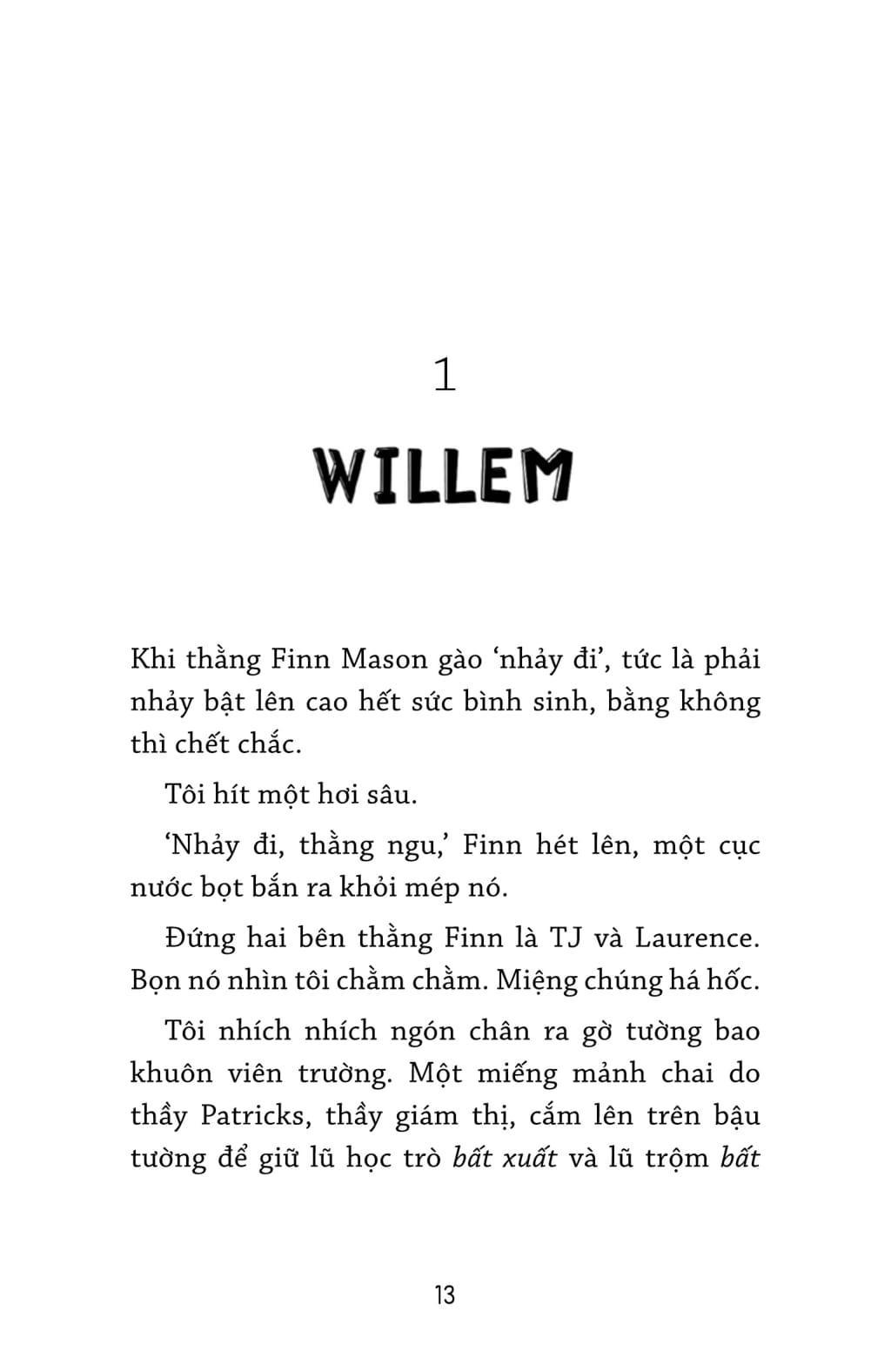 Cầm đầu mấy đứa Giang hồ Phố Beckham trong lớp Willem là thằng Finn. Hai đứa "tà lọt" cho thằng Finn là thằng Laurence và TJ. Ba thằng ôn con này gặp Willem đâu là bắt nạt đó, cái trò thằng Finn khoái nhất là bắt Willem leo lên bàn, leo lên kệ leo lên bất cứ gì và nhảy xuống theo tiếng hô của nó! Nhưng bữa đó thật bá đạo quá quắt, ba thằng dí Willem trèo lên bờ tường bao khuôn viên trường và bắt thằng nhỏ phải nhảy xuống. Cái tường cao thế kia, lại còn găm đầy miểng chai trên bề mặ