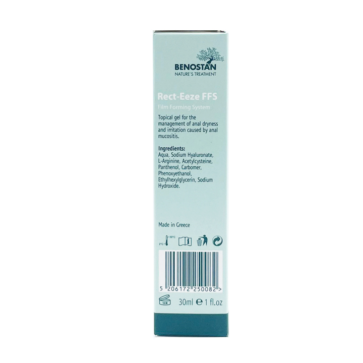 Benostan Nature's Treatment Rect-Eeze FFS (Hộp chứa một tuýp 30 ml, một vòi nhựa) có thương hiệu và được sản xuất bởi Benostan Health Products S.A., có nguồn gốc từ Hy Lạp. Tên sản phẩm: Hệ thống tạo màng phim dùng trong kiểm soát tình trạng khô và kích ứng niêm mạc hậu môn Rect-Eeze FFS Thương hiệu: Benostan Xuất xứ: Hy Lạp Thành phần: Nước tinh khiết (Aqua), Natri hyaluronat, L-Arginin, Acetylcystein, Panthenol, Carbomer, Phenoxyethanol, Ethylhexyglycerin, Natri Hydroxid Quy cách đóng gói: Hộp chứa một tuýp 30 ml, một vòi nhựa Hạn sử dụng: 36 tháng. Hạn sử dụng sau khi mở nắp là 12 tháng. Số công bố: 230000552/PCBA-HCM Công dụng: Được dùng để kiểm soát tình trạng khô và kích ứng hậu môn do viêm niêm mạc hậu môn gây ra bởi liệu pháp xạ trị hoặc hóa trị vùng bụng. Sự kết hợp giữa các thành phần: