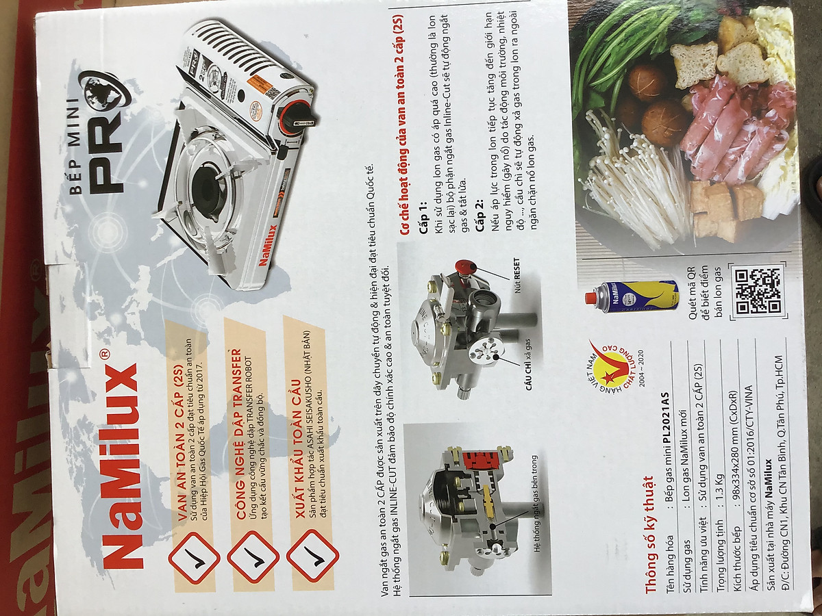 ĐẶC ĐIỂM NỔI BẬT ĐỘ AN TOÀN CAO Bếp gas mini NaMilux được trang bị hệ thống van Inline Cut - ngắt gas tự động, được sản xuất trên dây chuyền đạt chuẩn Quốc Tế