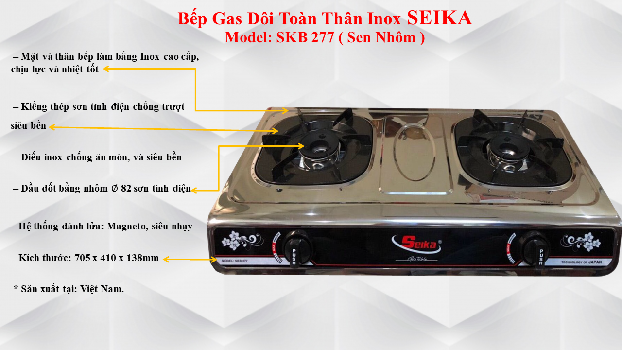 - Bếp Gas Đôi Toàn Thân Inox Seika SKB277 - Hàng Chính Hãng có thiết kế nhỏ gọn, dễ dàng phù hợp với nhiều không gian bếp, ngoài ra với bề mặt kính luôn sáng