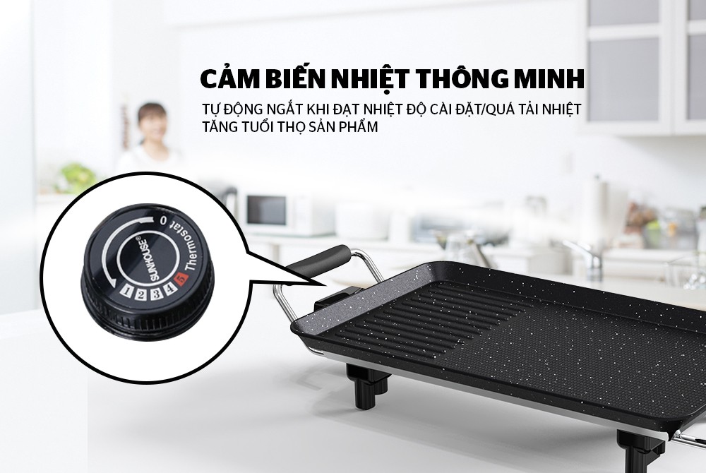 Đặc điểm nổi bật Bếp nướng không khói. Đại tiệc BBQ ngay tại nhà. Thiết kế khay nướng rộng, có rãnh, kiểu dáng đẹp mắt. Nhiều mức chỉnh nhiệt phù hợp cho từng món ăn. Nướng